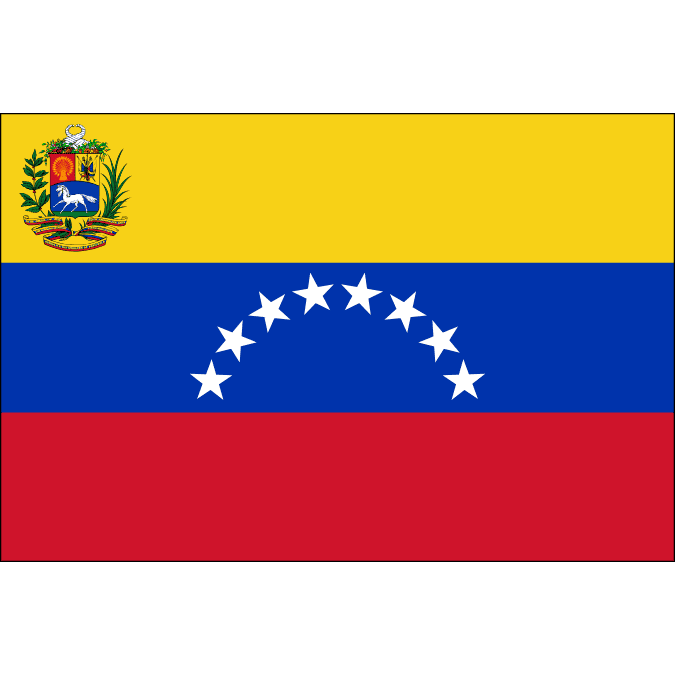 ベネズエラの国旗は黄・青・赤の横3色旗で、青の部分に弧を描いて8つの白い星が配置されています。色は大コロンビア連邦の旗に由来し、星は独立時の8つの州を表しています。2006年に星が7つから8つに増えました。