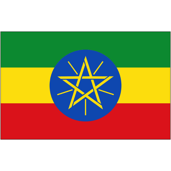 エチオピアの国旗は緑・黄・赤の横3色旗で、中央に青い円と国章があります。色はパン・アフリカニズムの色で、青い円は国の統一と平和を表しています。アフリカで唯一植民地支配を受けなかった国として知られています。