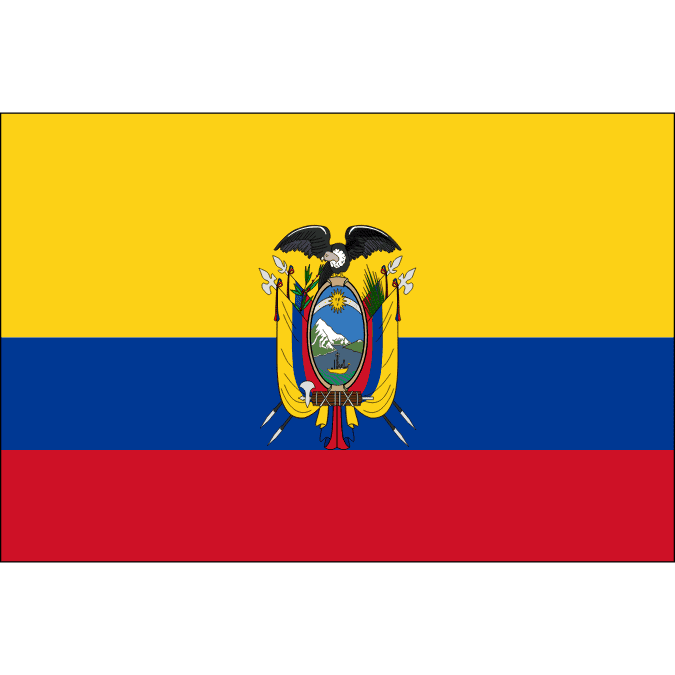エクアドルの国旗は黄・青・赤の横3色旗で、中央に国章があります。色はコロンビアやベネズエラと同じく大コロンビア連邦の旗に由来し、国章にはアンデスのコンドルや太陽などが描かれています。