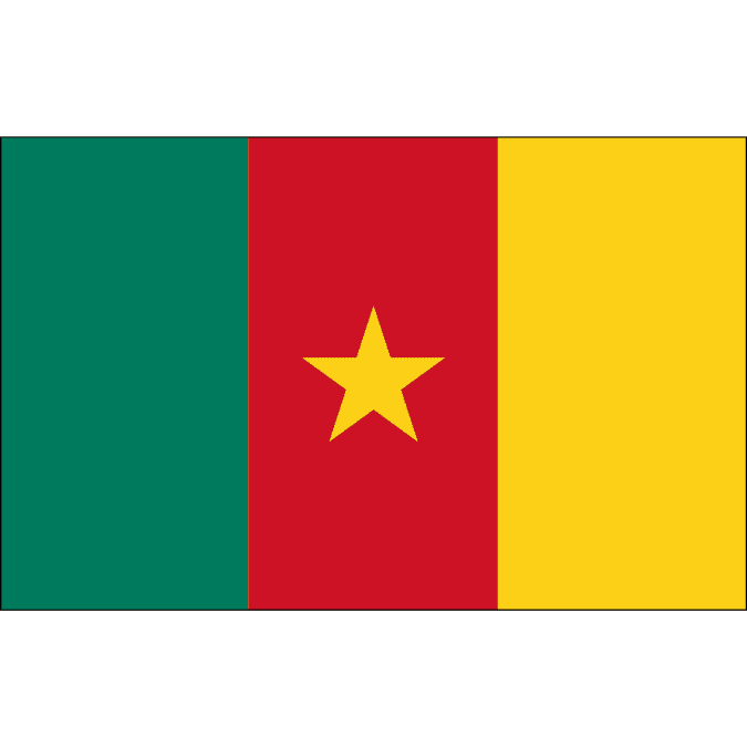 カメルーンの国旗は緑・赤・黄の縦3色旗で、中央に黄色の星があります。緑は南部の森林を、赤は統一を、黄色は太陽と繁栄を、星は国の統一を象徴しています。