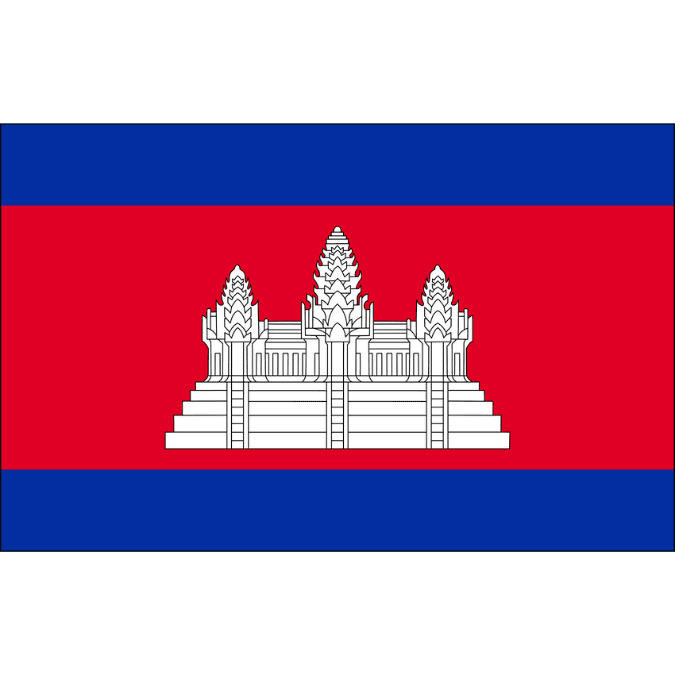 カンボジアの国旗は中央に青地の帯があり、上下が赤の三色旗で、中央にアンコールワットの白いシルエットがあります。青は王室、赤は国民、アンコールワットは国の遺産と宗教を象徴しています。