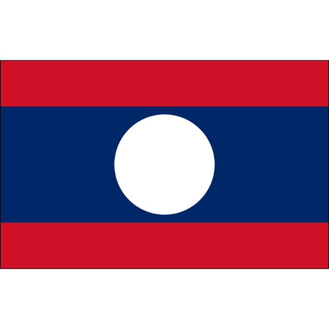 ラオスの国旗は上下に青の帯があり、中央に赤の太い帯と白い円があります。青は国の豊かさを、赤は独立のための闘争を、白い円は月と国の明るい未来を象徴しています。
