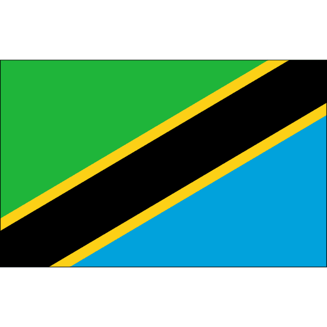 タンザニアの国旗は、緑と黒の間に黄色の縁取りがある対角線で区切られた三角形で構成されています。緑は豊かな植生を、黒は国民を、黄色は鉱物資源を、青は国内の湖や海を象徴しています。