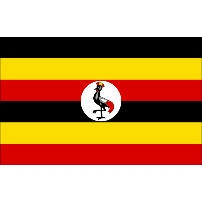 ウガンダの国旗は黒・黄・赤の横3色旗で、中央に白い円と国鳥のアカオノトリがデザインされています。黒はアフリカ人を、黄は太陽を、赤は兄弟愛を、鳥は国民を象徴しています。