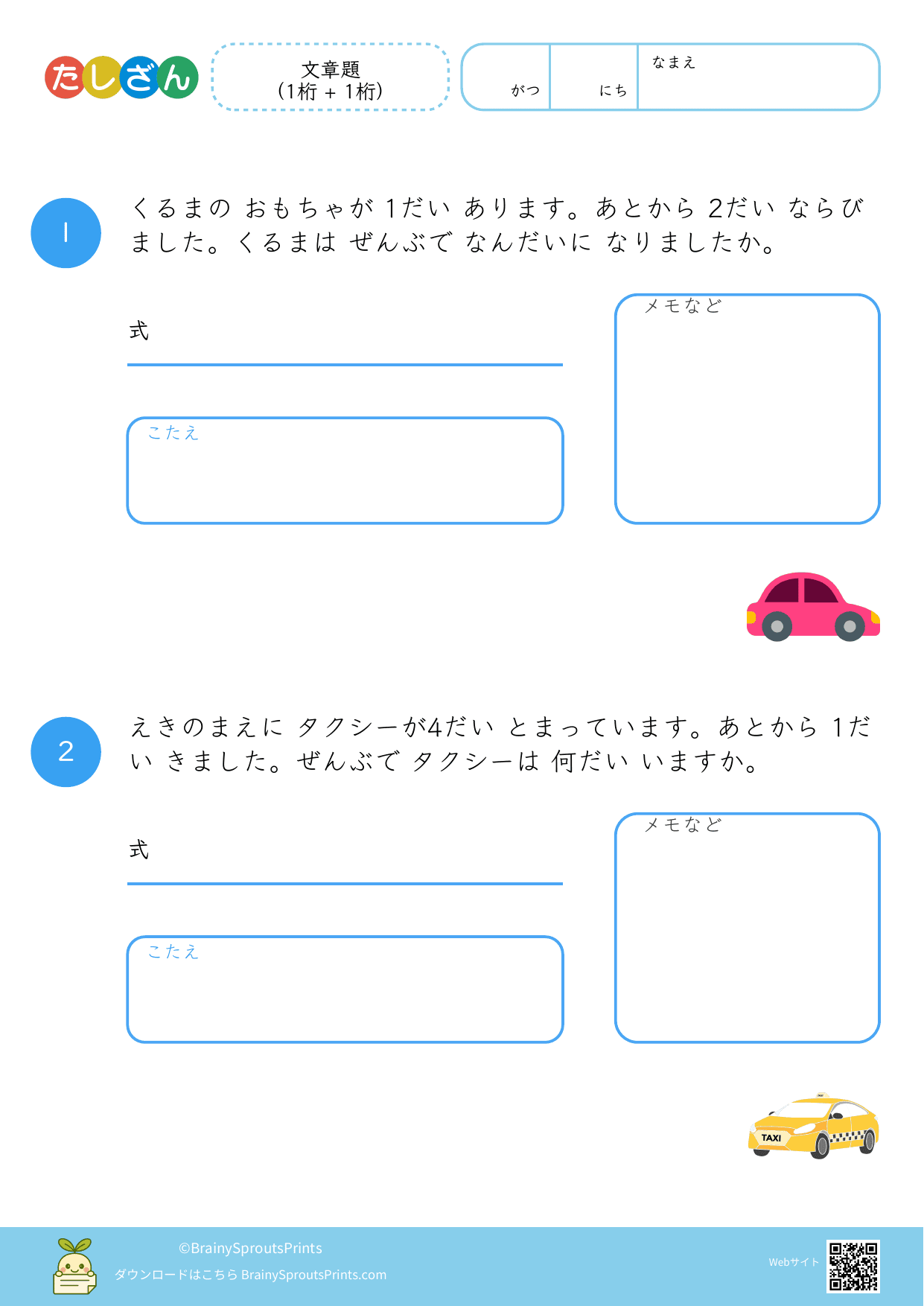 文章の中から、たし算の場面を読み取って式に結びつけやすいプリントです。計算そのものより、何が増えるのか、何を合わせるのかをつかめるかが大切になります。 式が合っていても、場面の理解が曖昧なことがあるので、考え方をことばにしながら進めると安定しやすくなります。