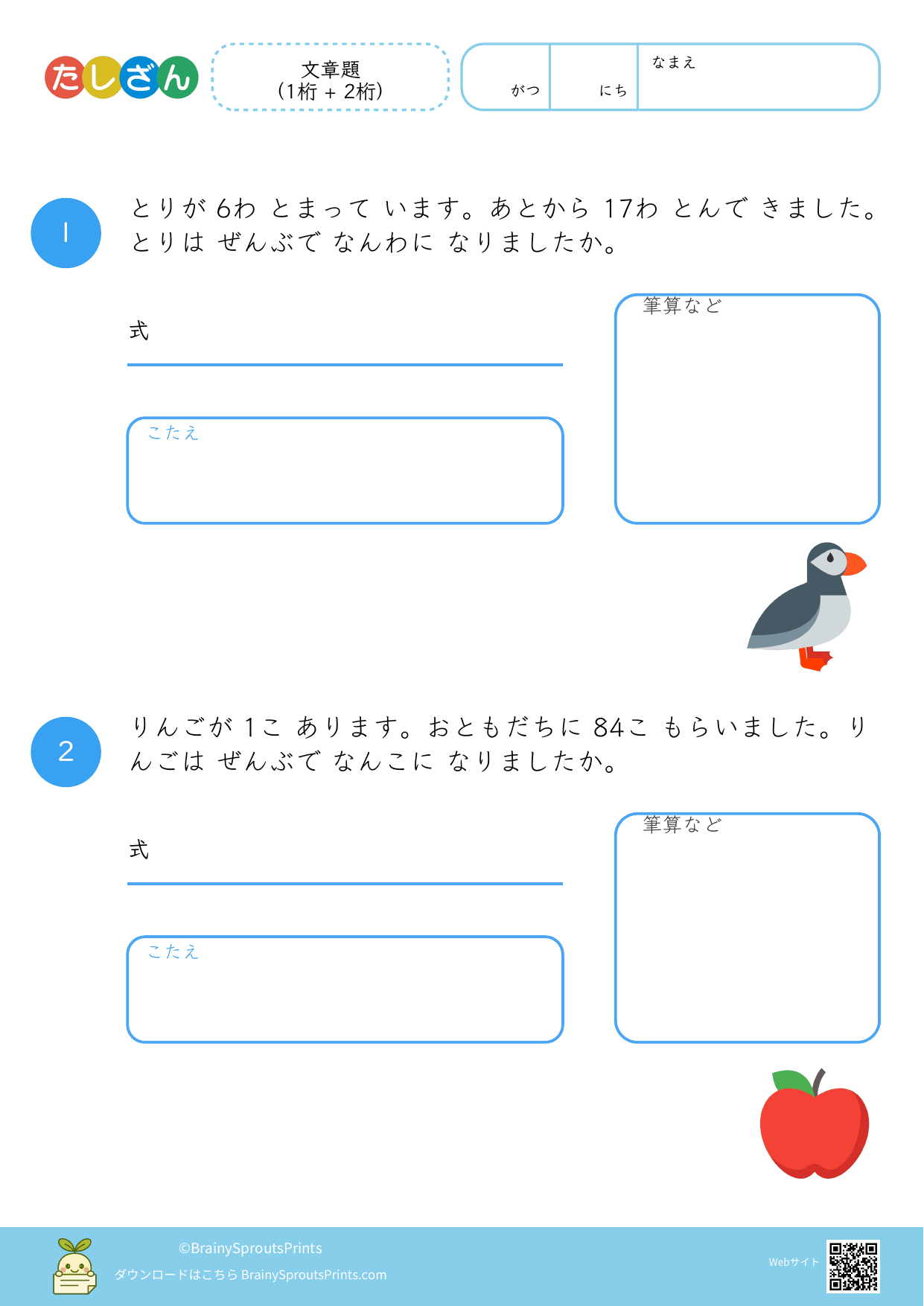 文章の中から、たし算の場面を読み取って式に結びつけやすいプリントです。計算そのものより、何が増えるのか、何を合わせるのかをつかめるかが大切になります。 式が合っていても、場面の理解が曖昧なことがあるので、考え方をことばにしながら進めると安定しやすくなります。
