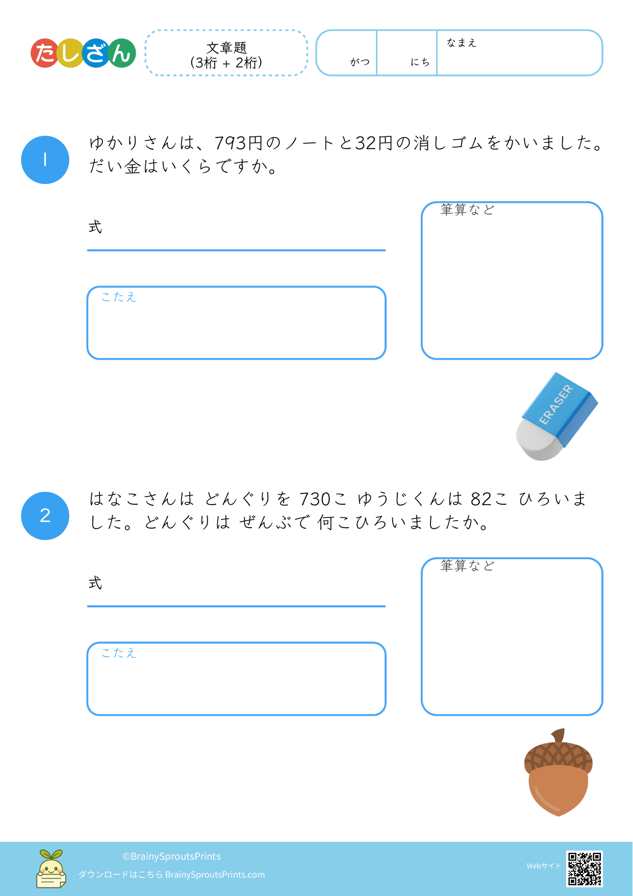 文章の中から、たし算の場面を読み取って式に結びつけやすいプリントです。計算そのものより、何が増えるのか、何を合わせるのかをつかめるかが大切になります。 式が合っていても、場面の理解が曖昧なことがあるので、考え方をことばにしながら進めると安定しやすくなります。