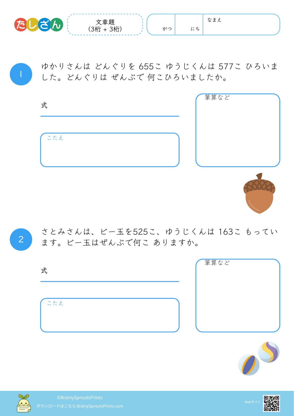 文章の中から、たし算の場面を読み取って式に結びつけやすいプリントです。計算そのものより、何が増えるのか、何を合わせるのかをつかめるかが大切になります。 式が合っていても、場面の理解が曖昧なことがあるので、考え方をことばにしながら進めると安定しやすくなります。