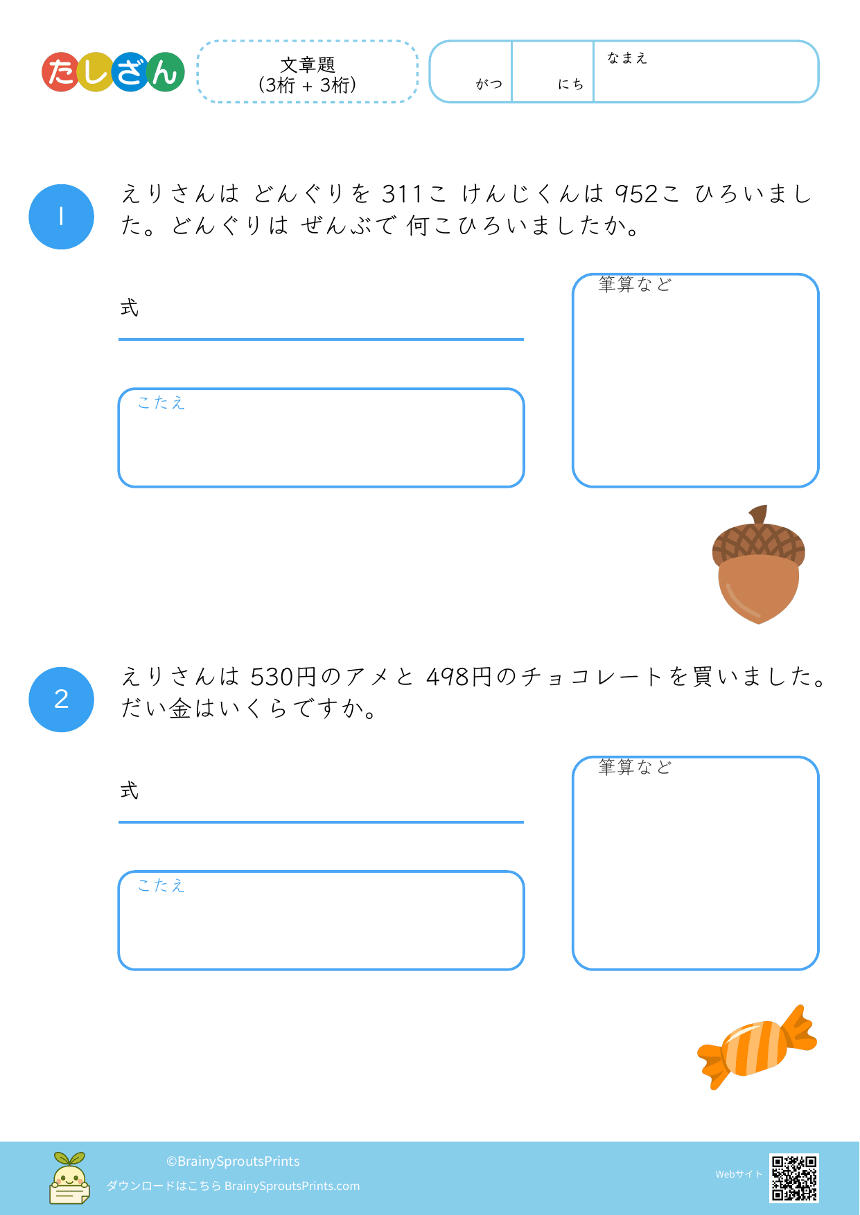 文章の中から、たし算の場面を読み取って式に結びつけやすいプリントです。計算そのものより、何が増えるのか、何を合わせるのかをつかめるかが大切になります。 式が合っていても、場面の理解が曖昧なことがあるので、考え方をことばにしながら進めると安定しやすくなります。