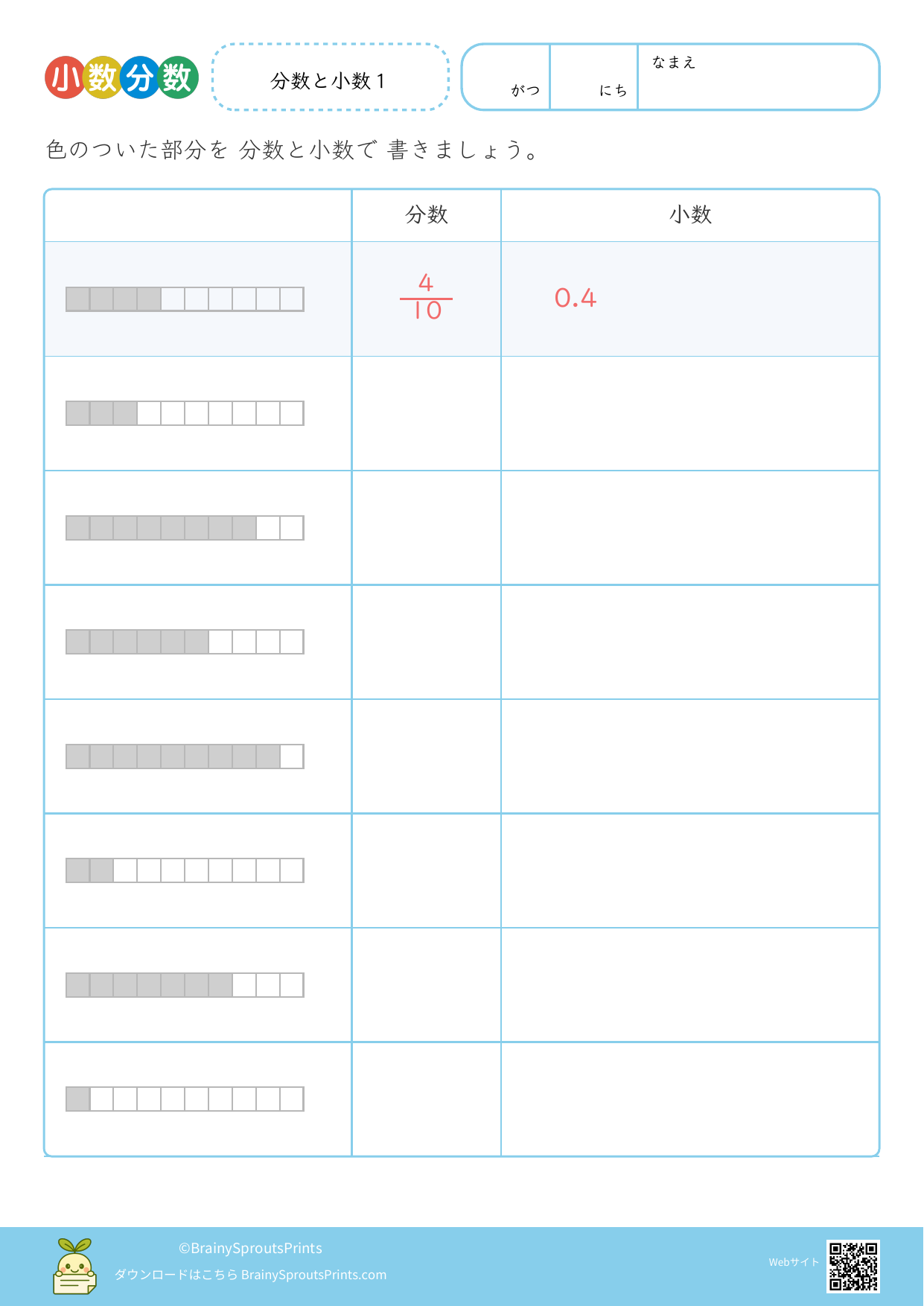 小数を数の大きさとして捉えながら、分数や図とのつながりも見やすいプリントです。位の並びだけでなく、1より小さい数をどう考えるかを整理したい時に向いています。