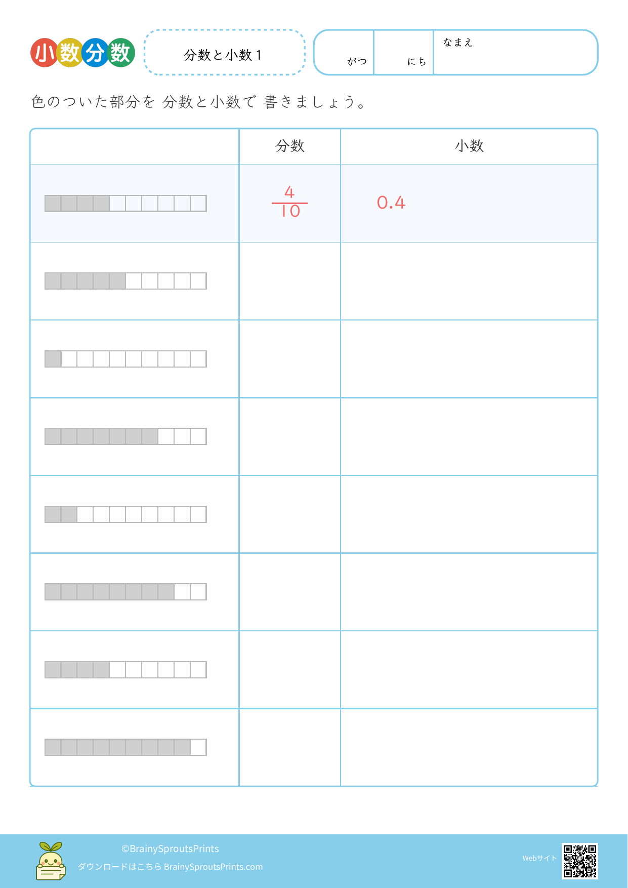 小数を数の大きさとして捉えながら、分数や図とのつながりも見やすいプリントです。位の並びだけでなく、1より小さい数をどう考えるかを整理したい時に向いています。