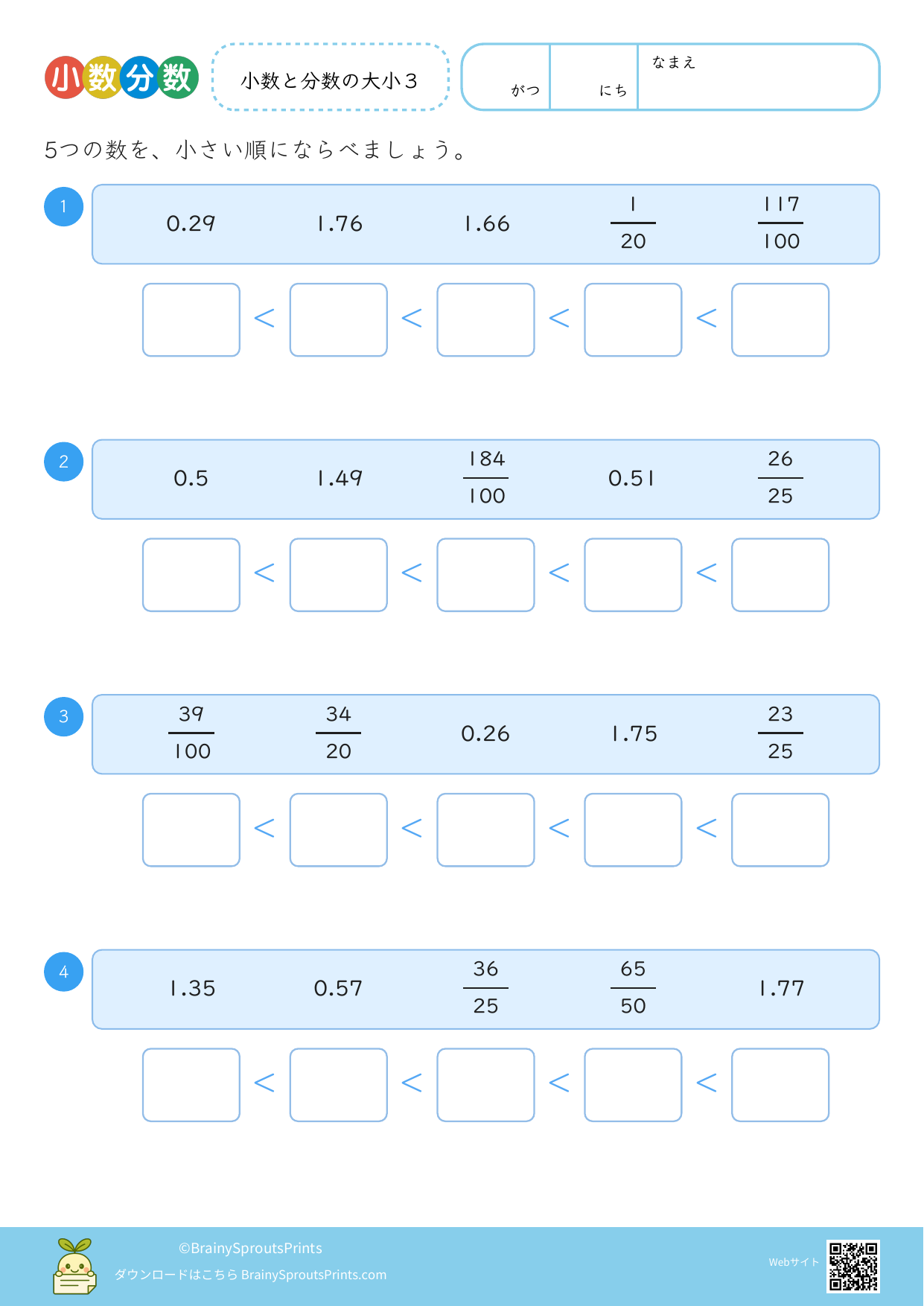 小数を数の大きさとして捉えながら、分数や図とのつながりも見やすいプリントです。位の並びだけでなく、1より小さい数をどう考えるかを整理したい時に向いています。