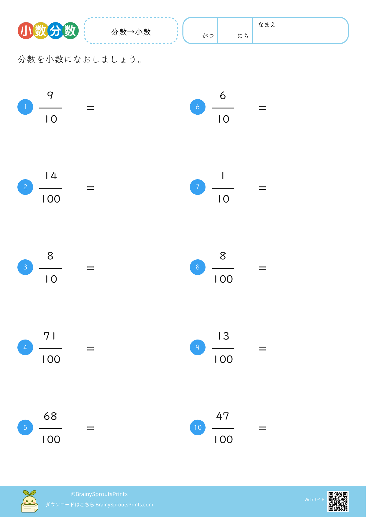小数を数の大きさとして捉えながら、分数や図とのつながりも見やすいプリントです。位の並びだけでなく、1より小さい数をどう考えるかを整理したい時に向いています。