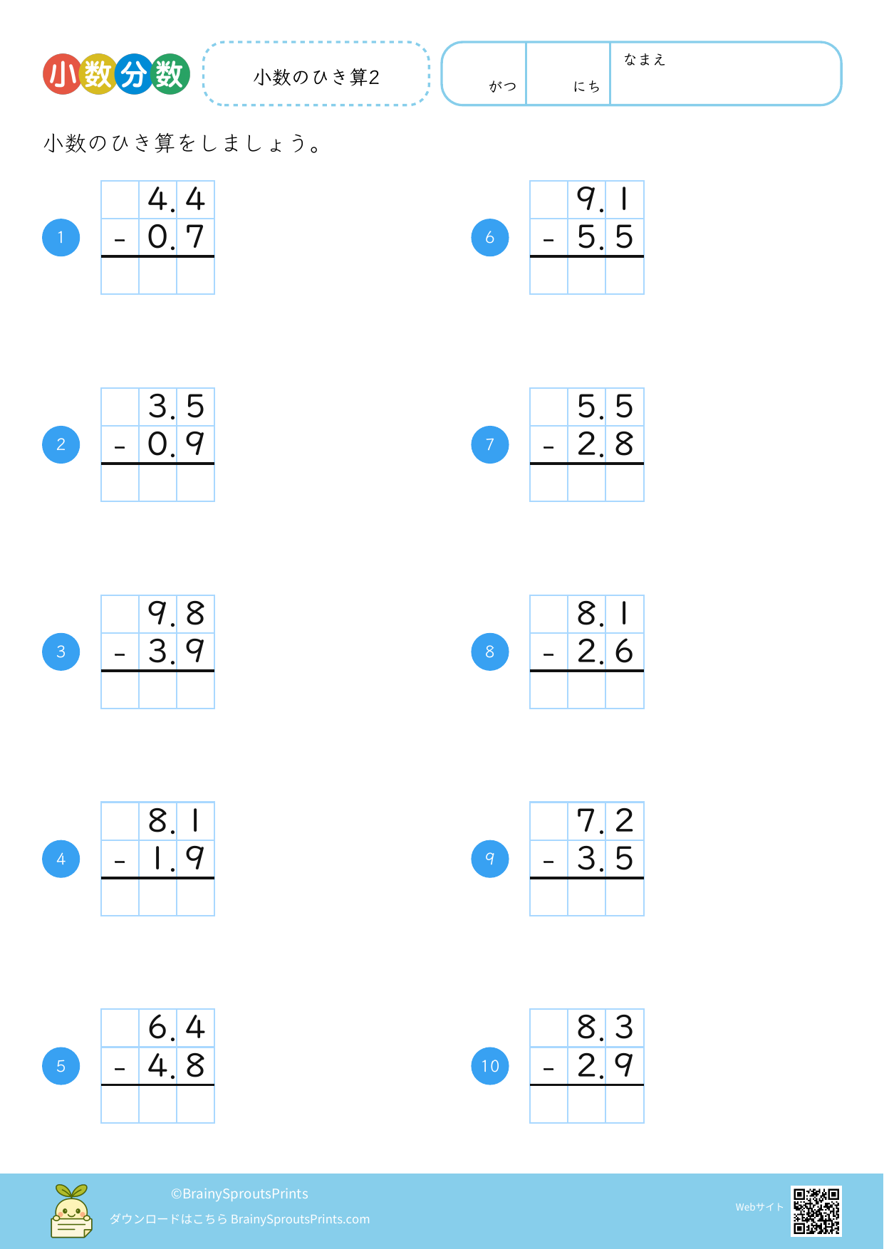 小数のひき算を、位をそろえる考え方や繰り下がりも含めて整理しながら進めやすいプリントです。小数点をそろえてから計算する流れを確認したいときに向いています。 答えを出すだけでなく、どの位から引いているのか、どこで繰り下がりが起きているのかを見ながら使うと、小数計算の理解が深まりやすくなります。
