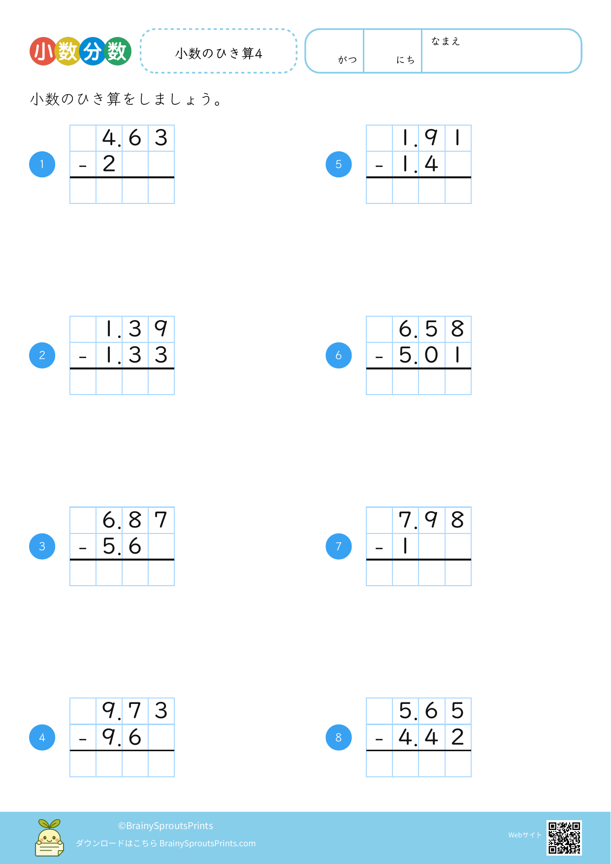 小数のひき算を、位をそろえる考え方や繰り下がりも含めて整理しながら進めやすいプリントです。小数点をそろえてから計算する流れを確認したいときに向いています。 答えを出すだけでなく、どの位から引いているのか、どこで繰り下がりが起きているのかを見ながら使うと、小数計算の理解が深まりやすくなります。