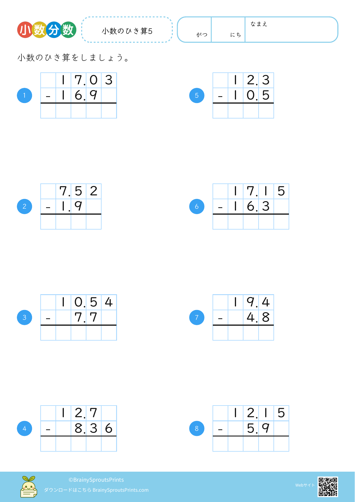 小数のひき算を、位をそろえる考え方や繰り下がりも含めて整理しながら進めやすいプリントです。小数点をそろえてから計算する流れを確認したいときに向いています。 答えを出すだけでなく、どの位から引いているのか、どこで繰り下がりが起きているのかを見ながら使うと、小数計算の理解が深まりやすくなります。