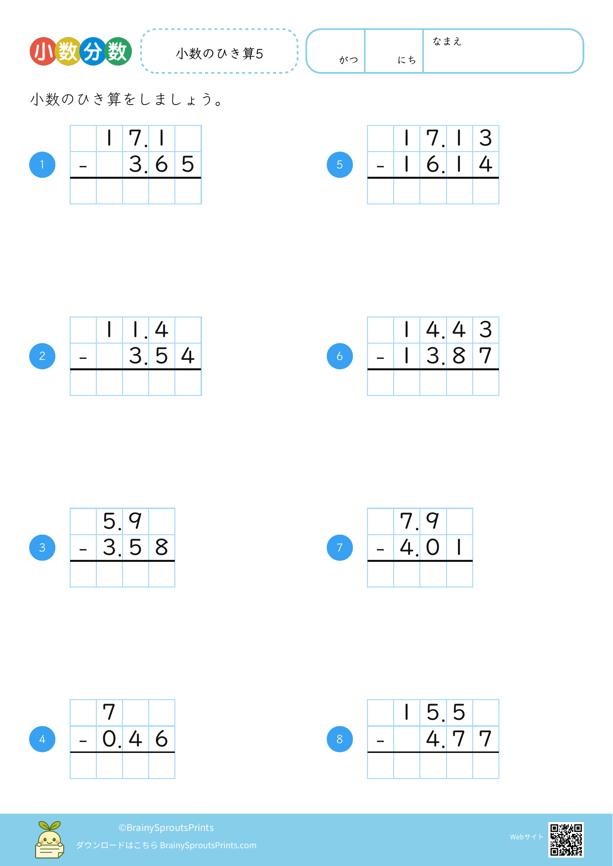小数のひき算を、位をそろえる考え方や繰り下がりも含めて整理しながら進めやすいプリントです。小数点をそろえてから計算する流れを確認したいときに向いています。 答えを出すだけでなく、どの位から引いているのか、どこで繰り下がりが起きているのかを見ながら使うと、小数計算の理解が深まりやすくなります。