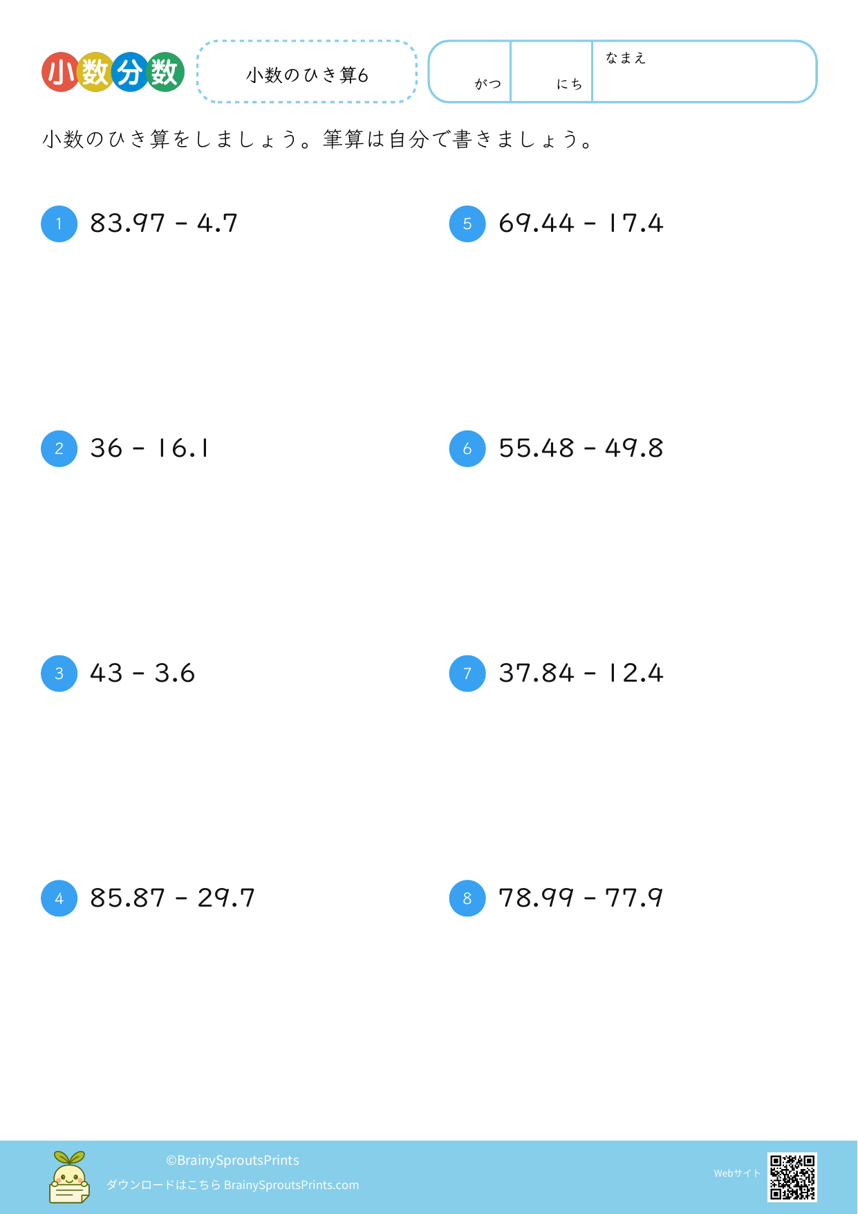 小数のひき算を、位をそろえる考え方や繰り下がりも含めて整理しながら進めやすいプリントです。小数点をそろえてから計算する流れを確認したいときに向いています。 答えを出すだけでなく、どの位から引いているのか、どこで繰り下がりが起きているのかを見ながら使うと、小数計算の理解が深まりやすくなります。
