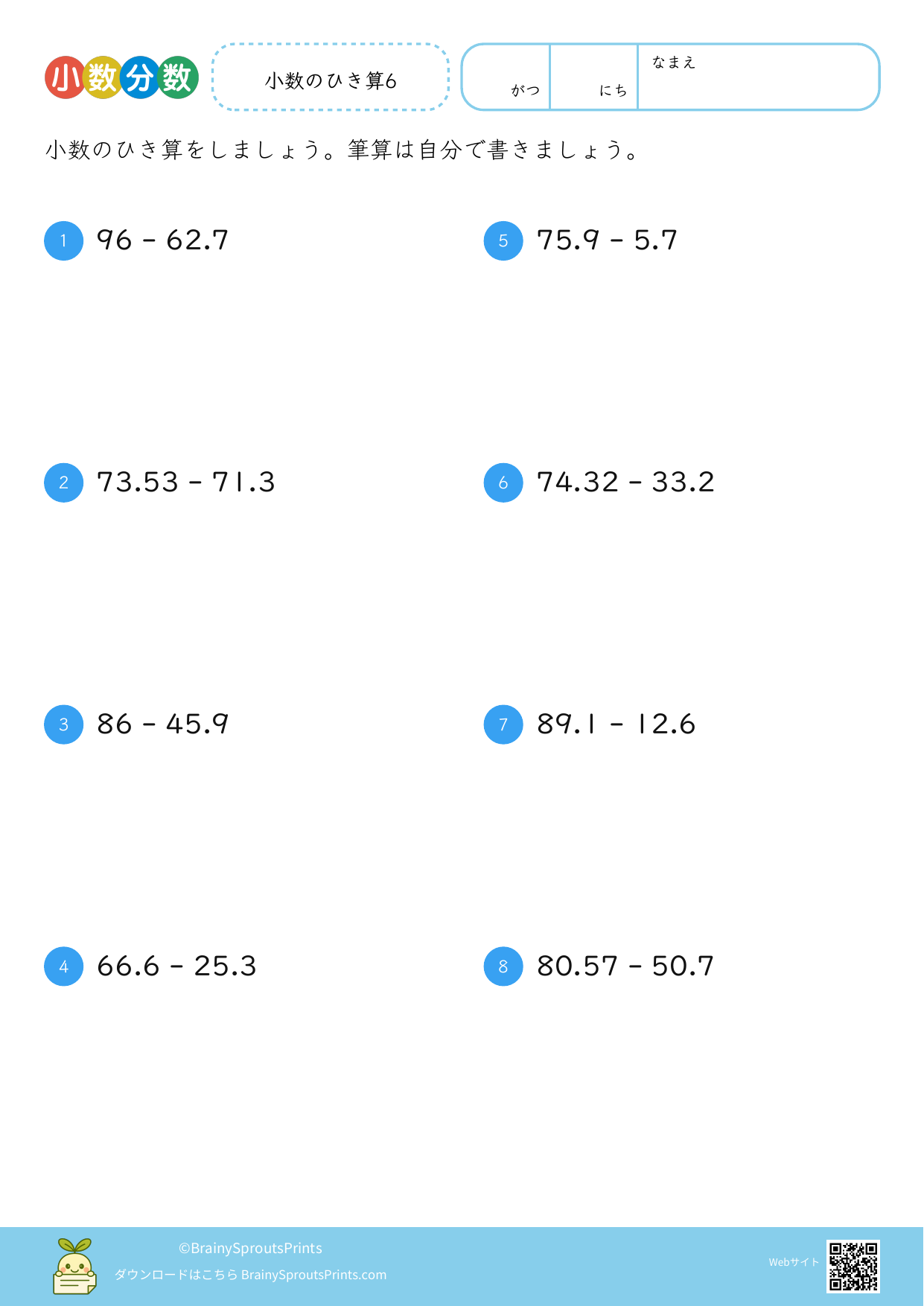 小数のひき算を、位をそろえる考え方や繰り下がりも含めて整理しながら進めやすいプリントです。小数点をそろえてから計算する流れを確認したいときに向いています。 答えを出すだけでなく、どの位から引いているのか、どこで繰り下がりが起きているのかを見ながら使うと、小数計算の理解が深まりやすくなります。