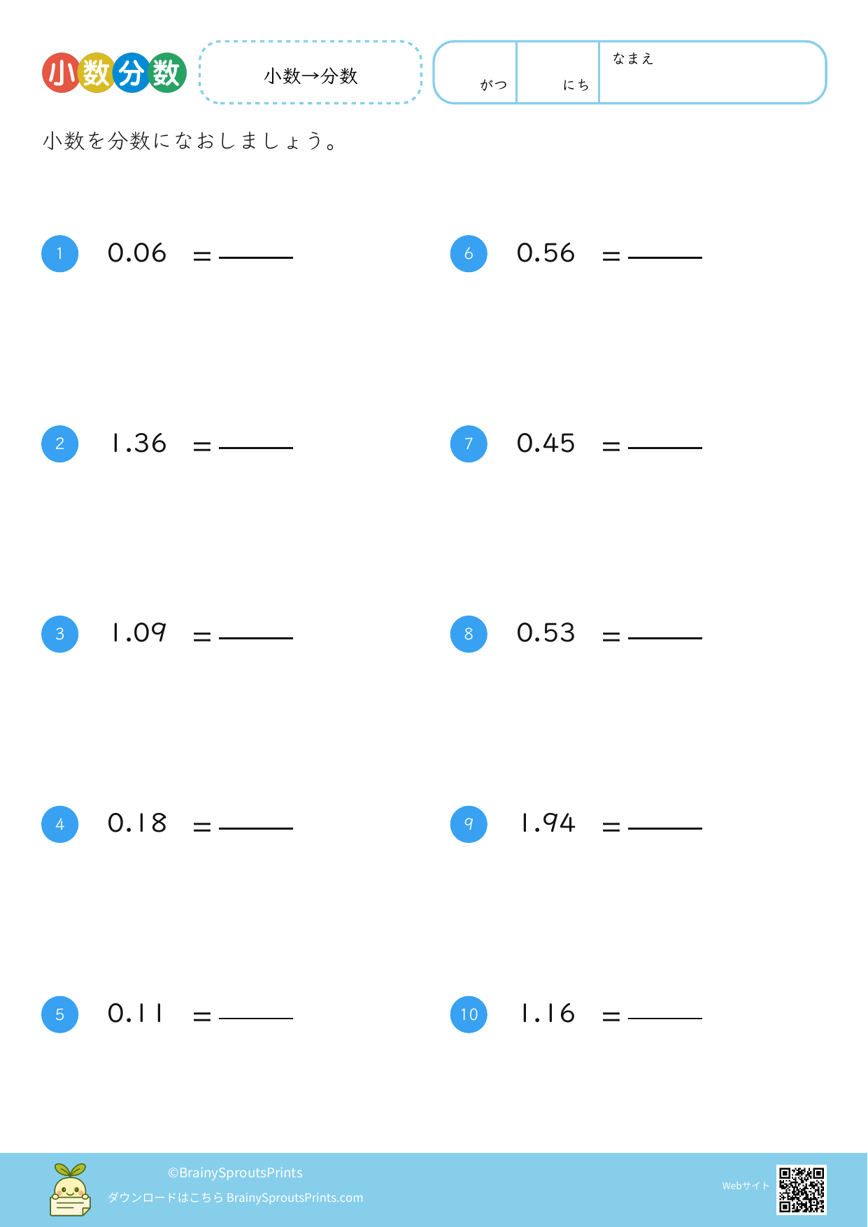 小数を数の大きさとして捉えながら、分数や図とのつながりも見やすいプリントです。位の並びだけでなく、1より小さい数をどう考えるかを整理したい時に向いています。