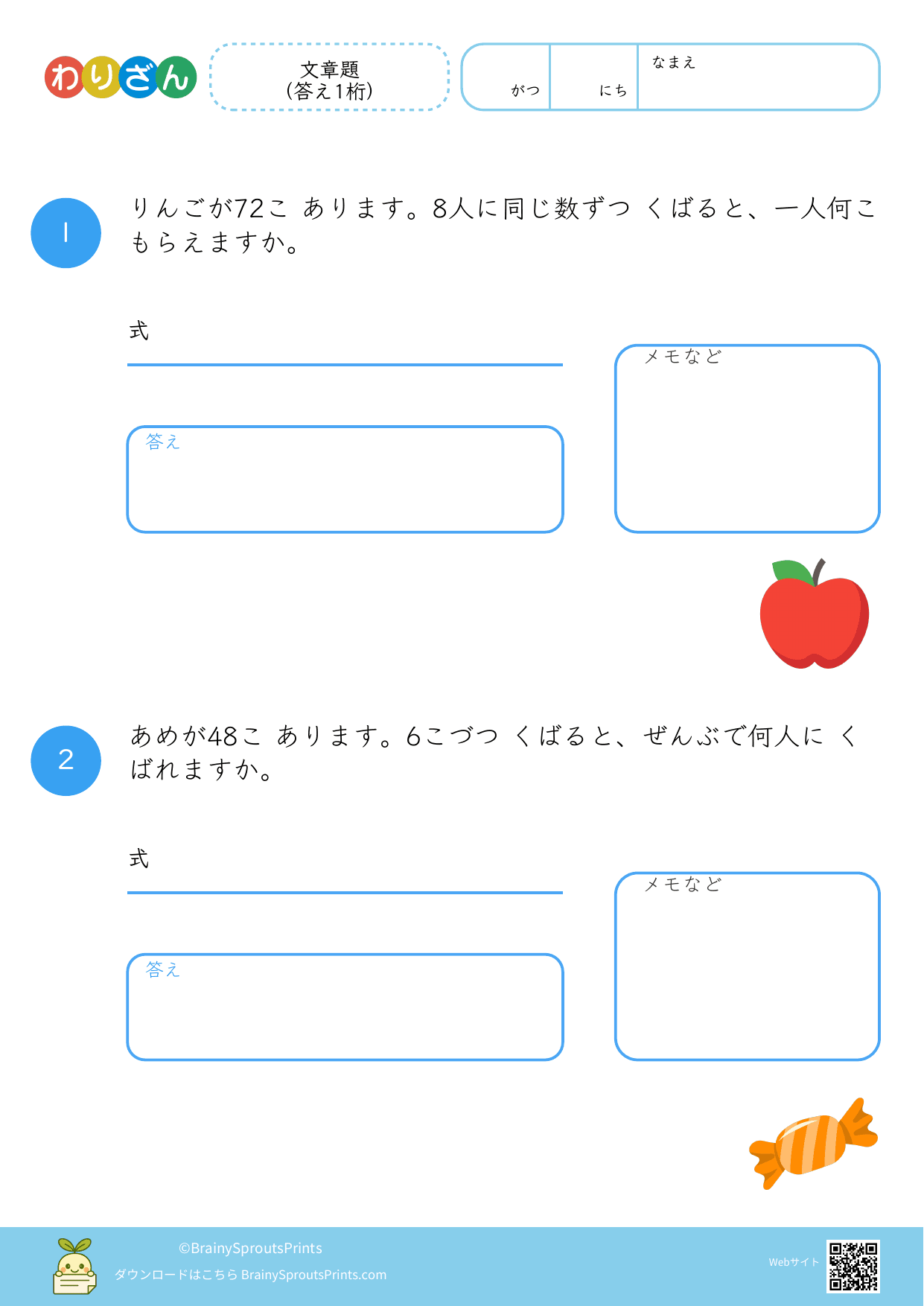分ける場面や、いくつ分あるかを考える場面を文章から読み取りやすいプリントです。わり算は場面の意味がつかめるかで理解が変わるので、式にする前の読み取りが大切になります。