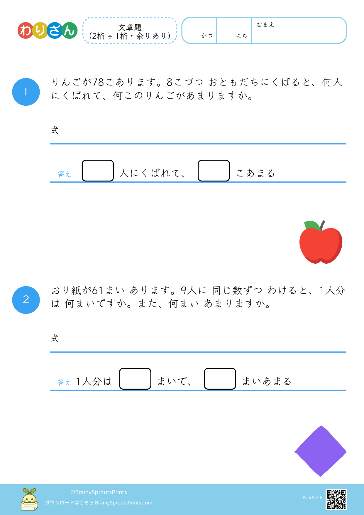 分ける場面や、いくつ分あるかを考える場面を文章から読み取りやすいプリントです。わり算は場面の意味がつかめるかで理解が変わるので、式にする前の読み取りが大切になります。