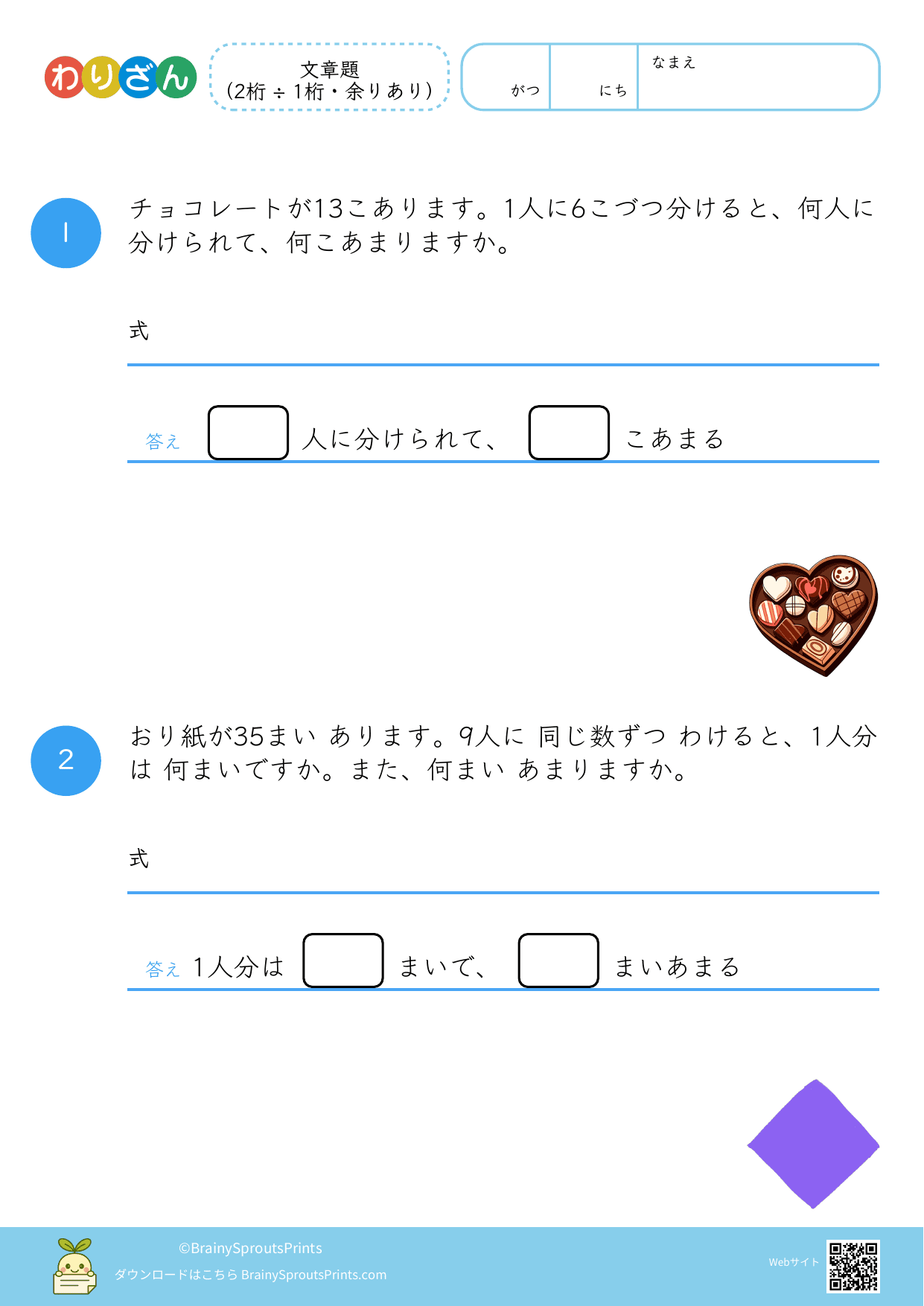 分ける場面や、いくつ分あるかを考える場面を文章から読み取りやすいプリントです。わり算は場面の意味がつかめるかで理解が変わるので、式にする前の読み取りが大切になります。