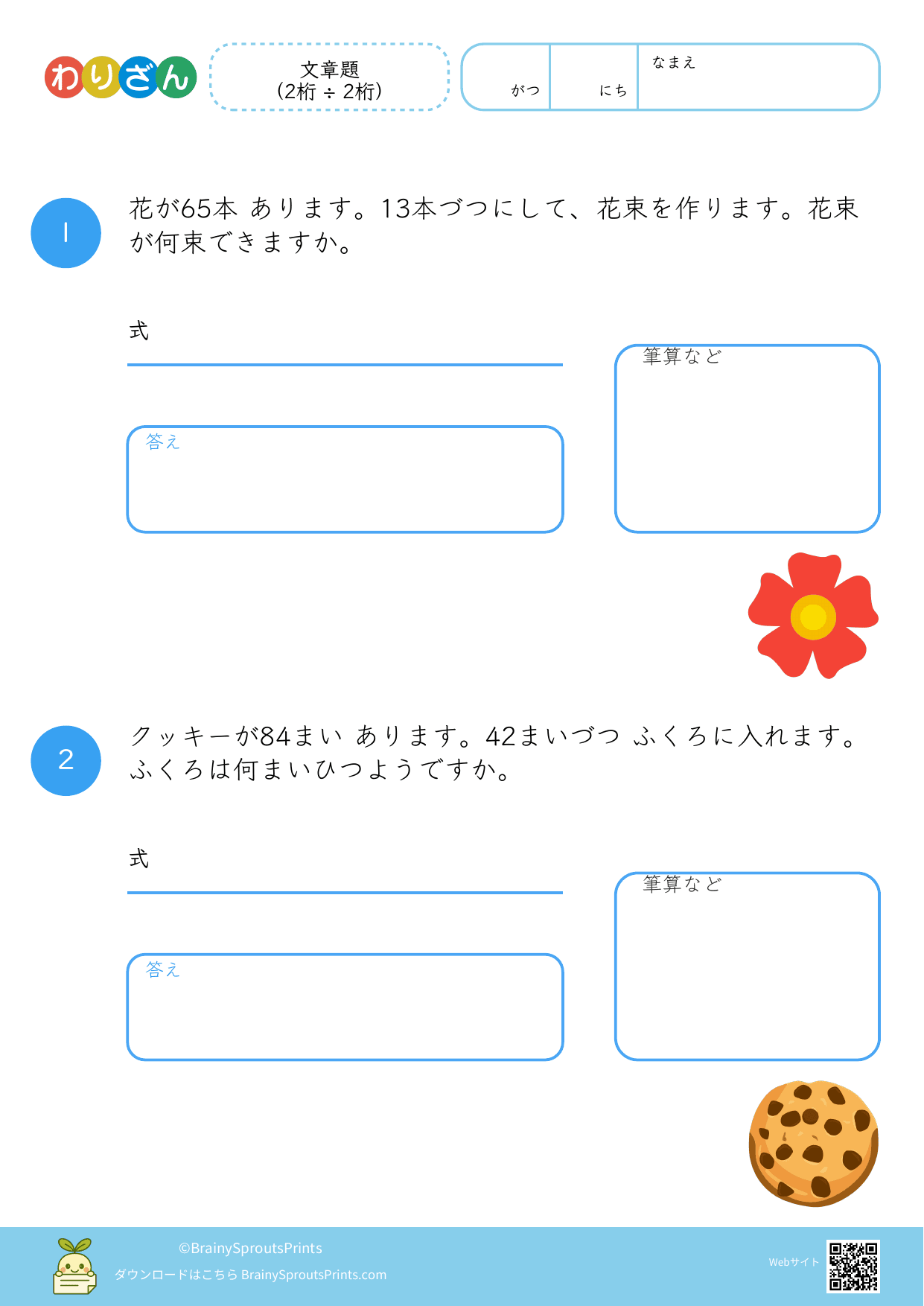 分ける場面や、いくつ分あるかを考える場面を文章から読み取りやすいプリントです。わり算は場面の意味がつかめるかで理解が変わるので、式にする前の読み取りが大切になります。