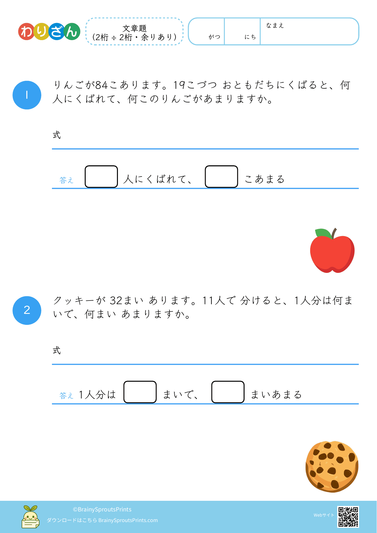 分ける場面や、いくつ分あるかを考える場面を文章から読み取りやすいプリントです。わり算は場面の意味がつかめるかで理解が変わるので、式にする前の読み取りが大切になります。