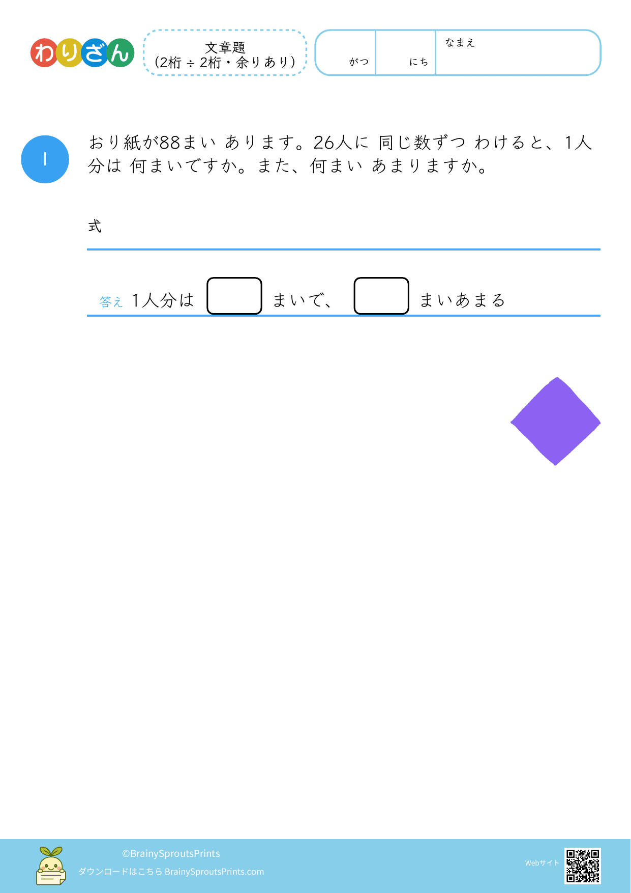 分ける場面や、いくつ分あるかを考える場面を文章から読み取りやすいプリントです。わり算は場面の意味がつかめるかで理解が変わるので、式にする前の読み取りが大切になります。