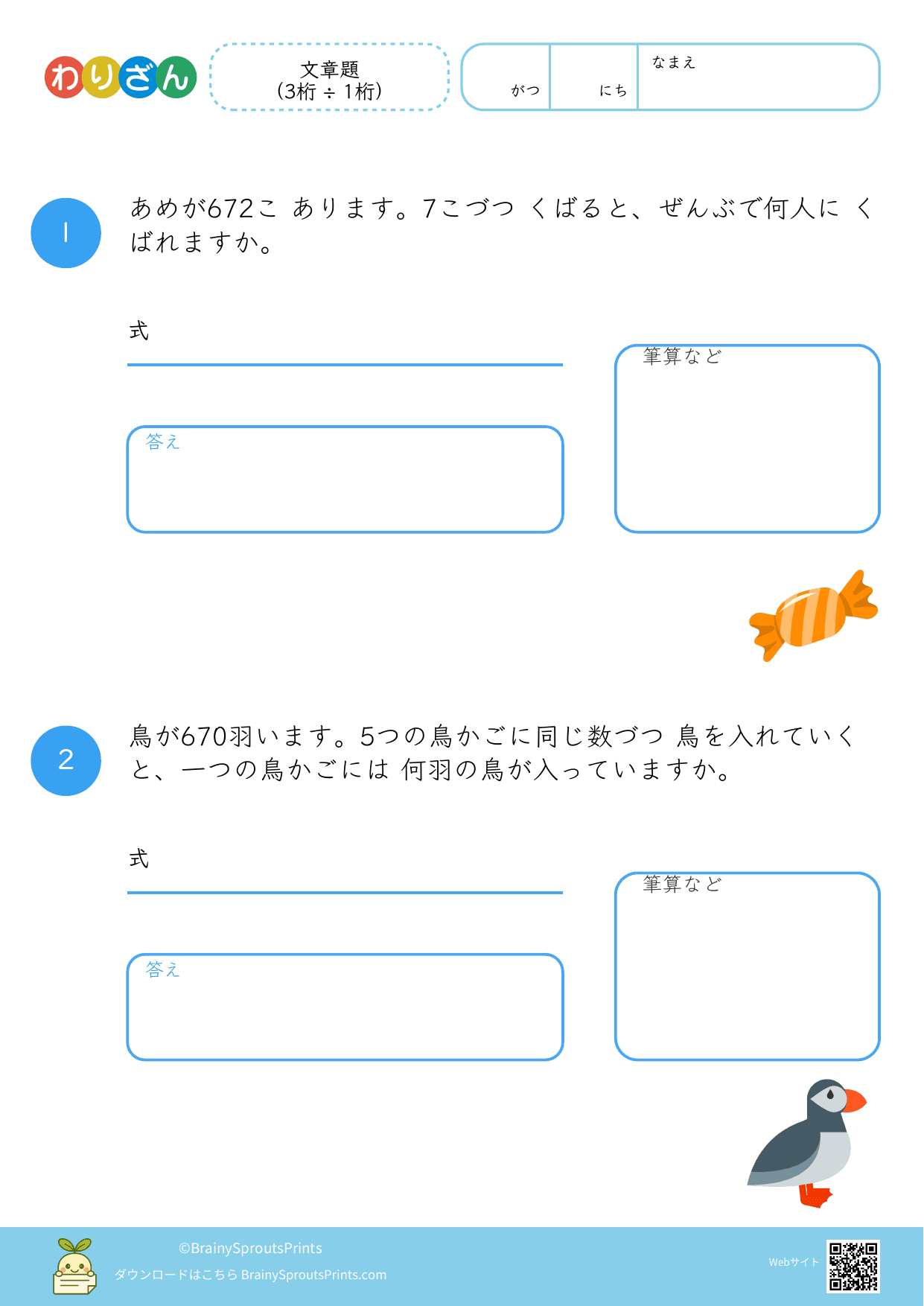 分ける場面や、いくつ分あるかを考える場面を文章から読み取りやすいプリントです。わり算は場面の意味がつかめるかで理解が変わるので、式にする前の読み取りが大切になります。