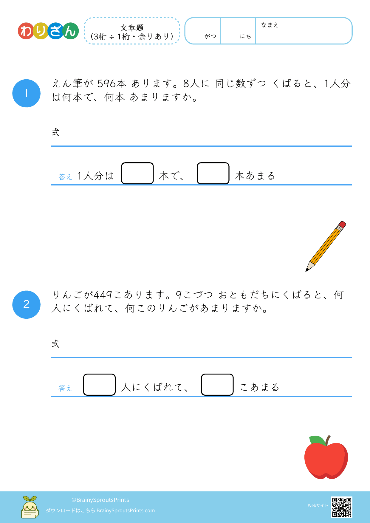 分ける場面や、いくつ分あるかを考える場面を文章から読み取りやすいプリントです。わり算は場面の意味がつかめるかで理解が変わるので、式にする前の読み取りが大切になります。