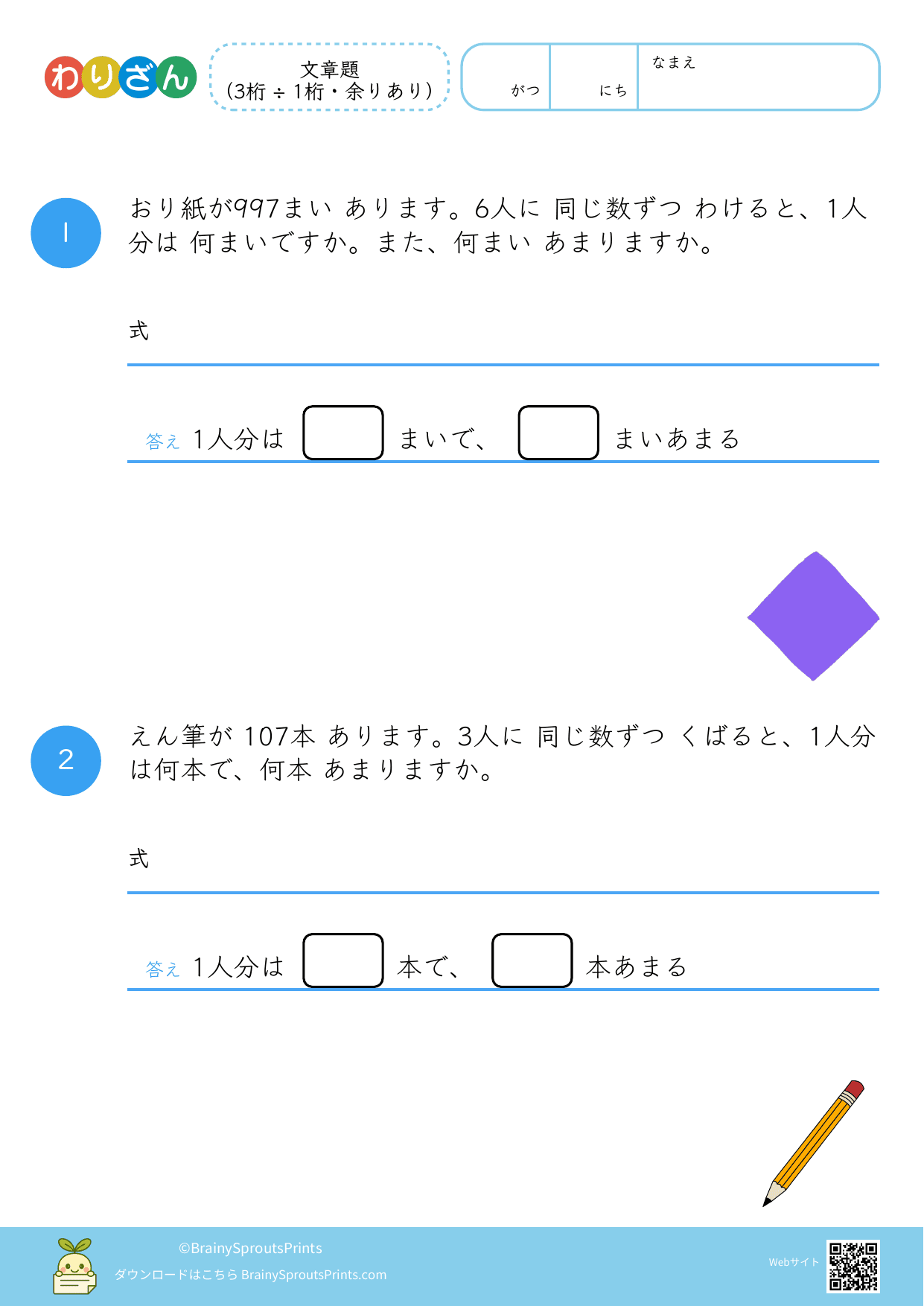 分ける場面や、いくつ分あるかを考える場面を文章から読み取りやすいプリントです。わり算は場面の意味がつかめるかで理解が変わるので、式にする前の読み取りが大切になります。