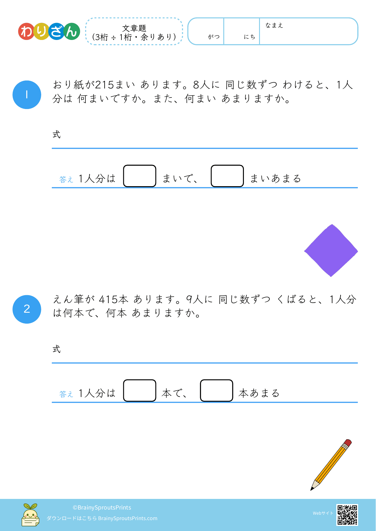 分ける場面や、いくつ分あるかを考える場面を文章から読み取りやすいプリントです。わり算は場面の意味がつかめるかで理解が変わるので、式にする前の読み取りが大切になります。