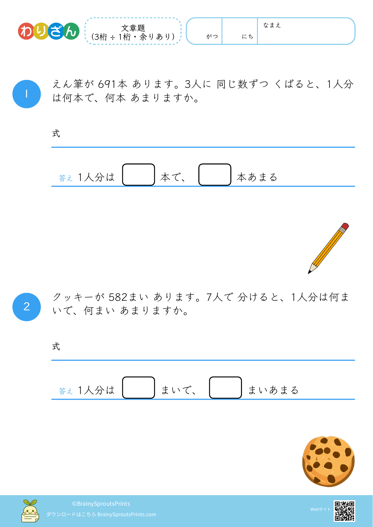 分ける場面や、いくつ分あるかを考える場面を文章から読み取りやすいプリントです。わり算は場面の意味がつかめるかで理解が変わるので、式にする前の読み取りが大切になります。
