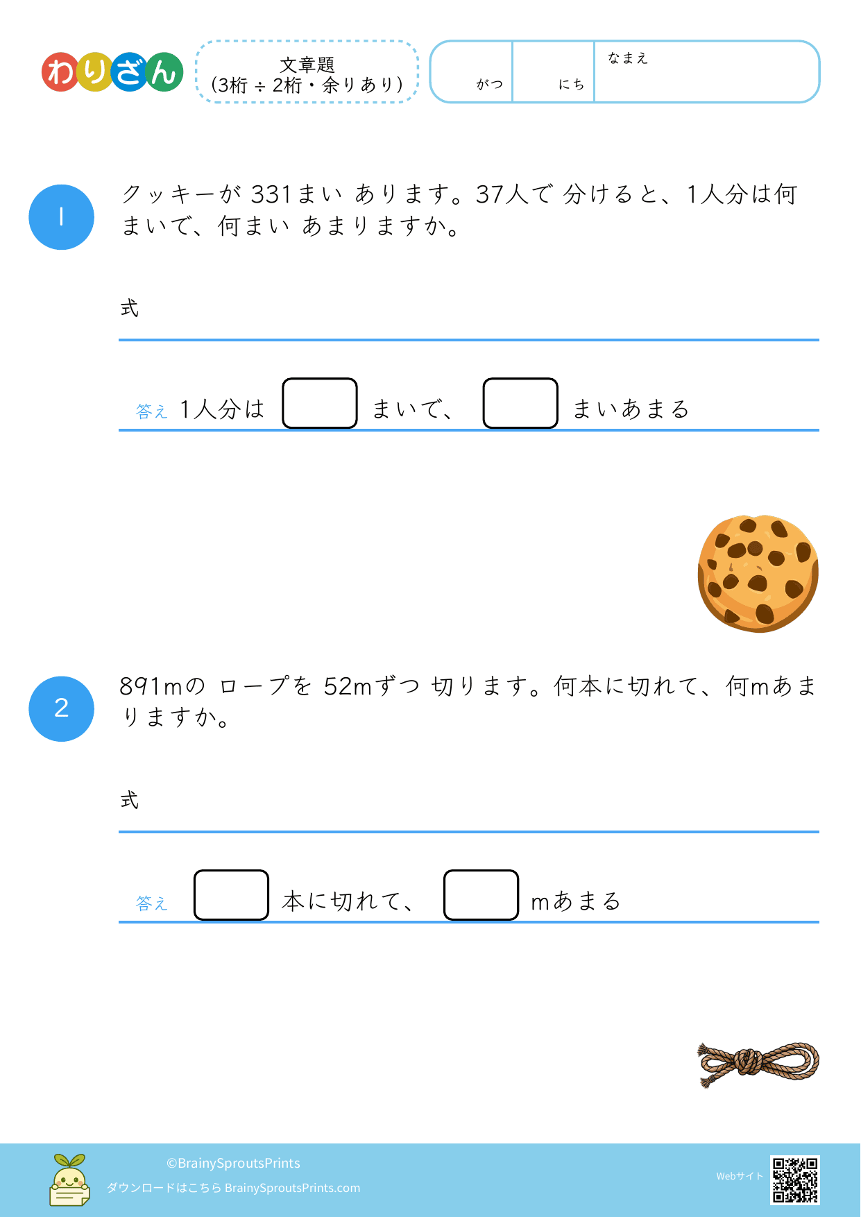 分ける場面や、いくつ分あるかを考える場面を文章から読み取りやすいプリントです。わり算は場面の意味がつかめるかで理解が変わるので、式にする前の読み取りが大切になります。