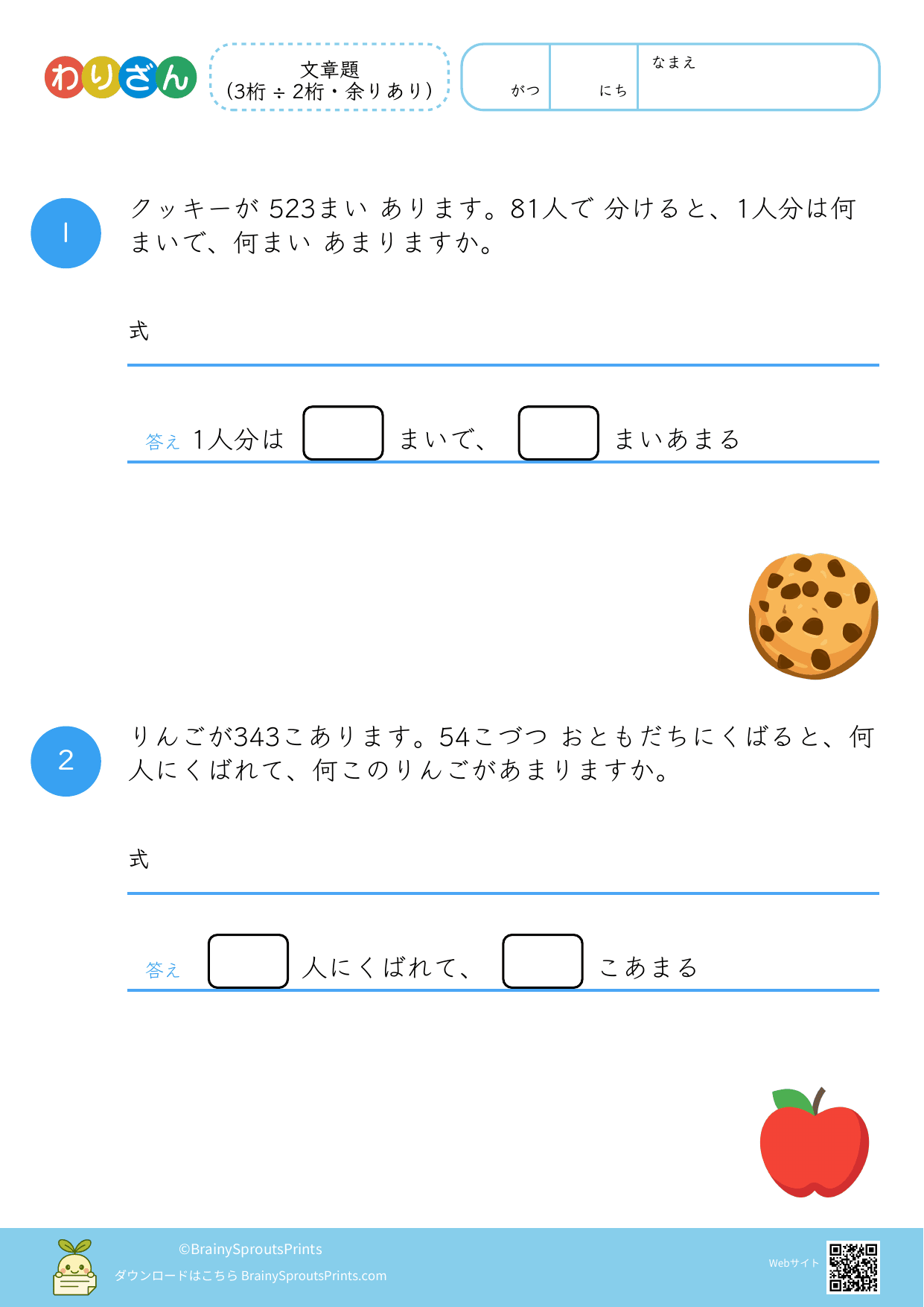分ける場面や、いくつ分あるかを考える場面を文章から読み取りやすいプリントです。わり算は場面の意味がつかめるかで理解が変わるので、式にする前の読み取りが大切になります。