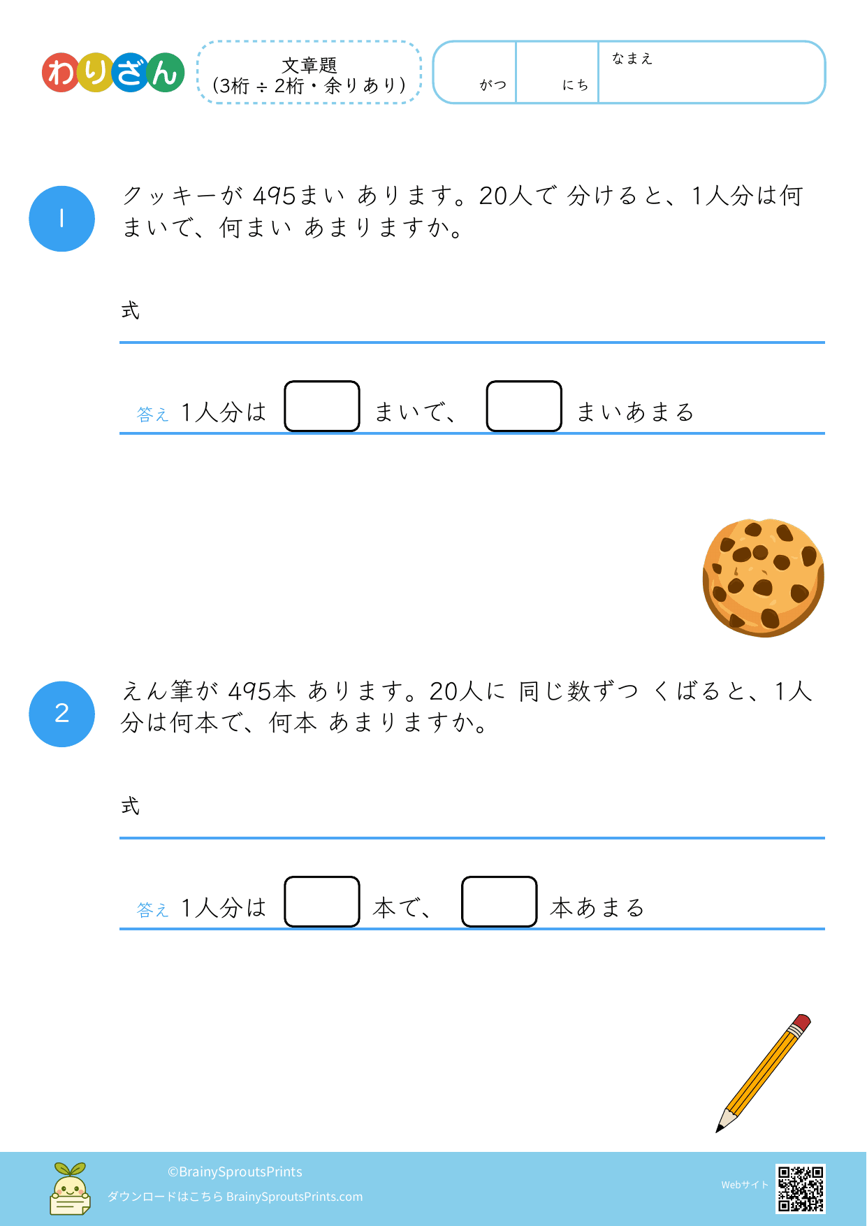 分ける場面や、いくつ分あるかを考える場面を文章から読み取りやすいプリントです。わり算は場面の意味がつかめるかで理解が変わるので、式にする前の読み取りが大切になります。
