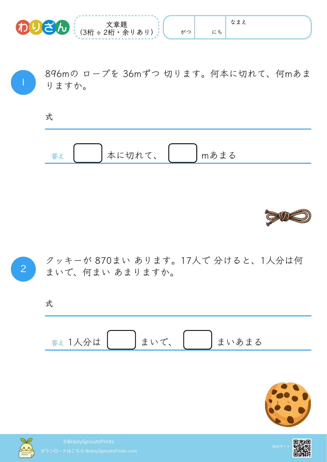 分ける場面や、いくつ分あるかを考える場面を文章から読み取りやすいプリントです。わり算は場面の意味がつかめるかで理解が変わるので、式にする前の読み取りが大切になります。