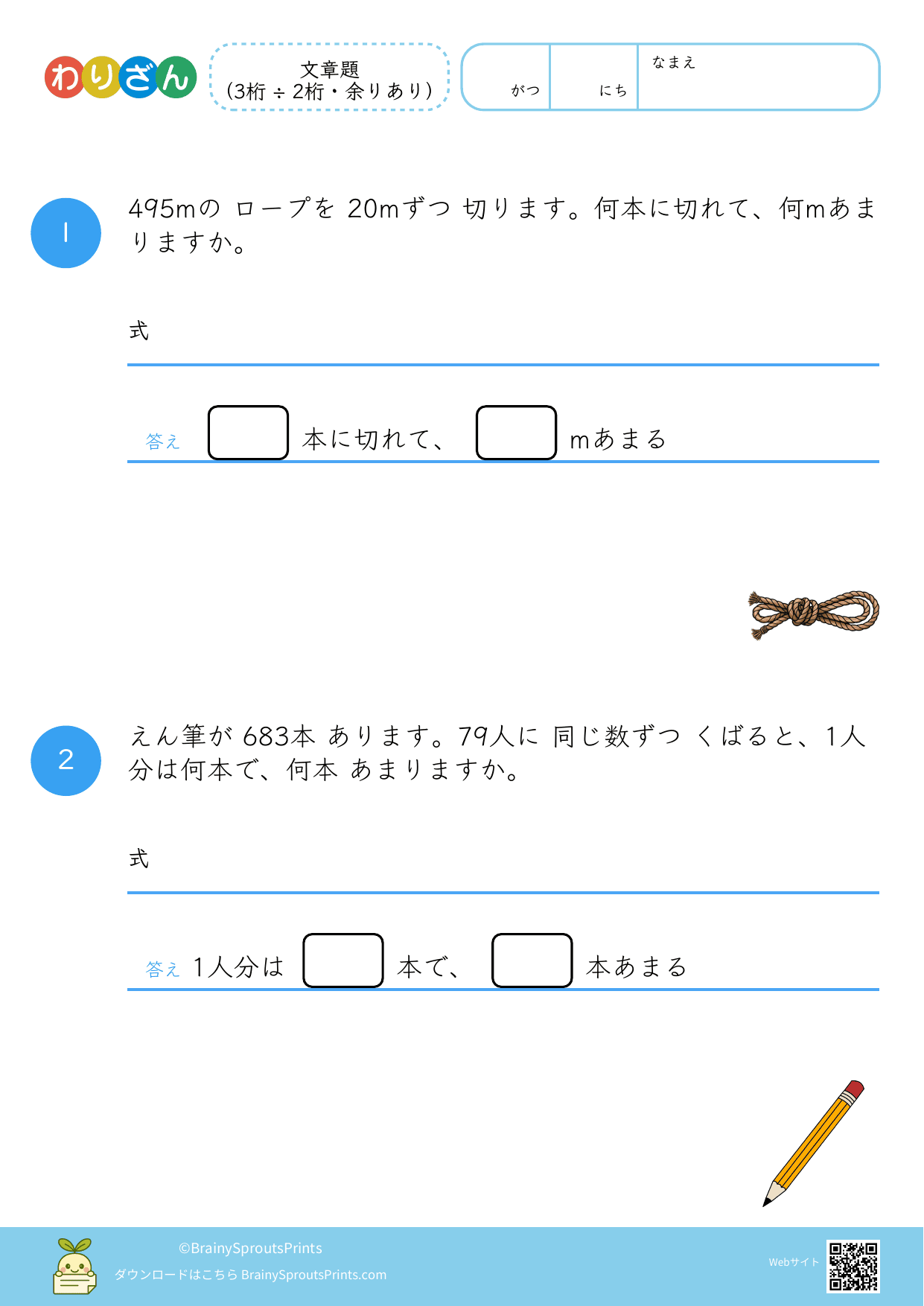 分ける場面や、いくつ分あるかを考える場面を文章から読み取りやすいプリントです。わり算は場面の意味がつかめるかで理解が変わるので、式にする前の読み取りが大切になります。