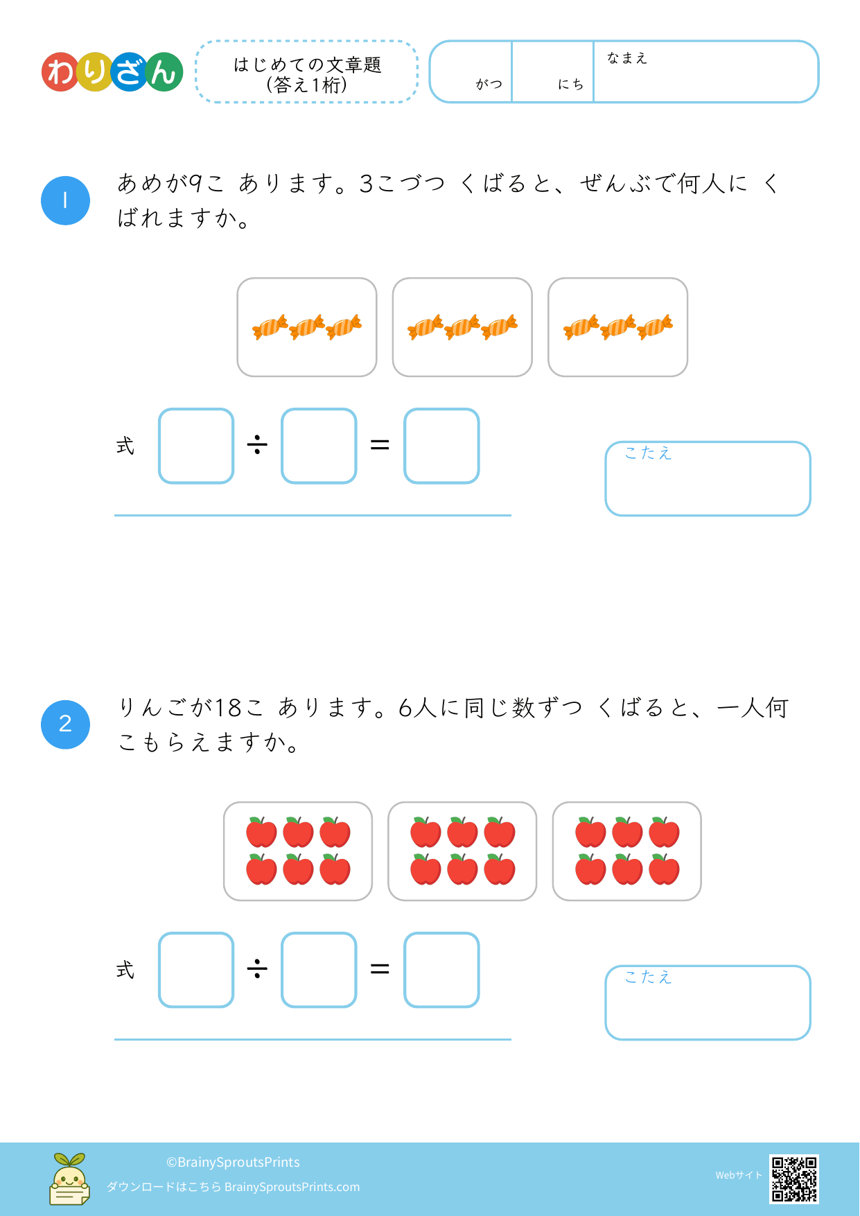 分ける場面や、いくつ分あるかを考える場面を文章から読み取りやすいプリントです。わり算は場面の意味がつかめるかで理解が変わるので、式にする前の読み取りが大切になります。