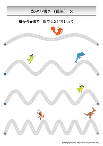 取り組んだあとは、「どの線がやりやすかった?」「どこが少しむずかしかった?」と聞くと、次に選ぶプリントの目安になります。 短い時間で気持ちよく終える方が続きやすいので、枚数を増やしすぎず、少し物足りないくらいで切り上げると取り入れやすくなります。
