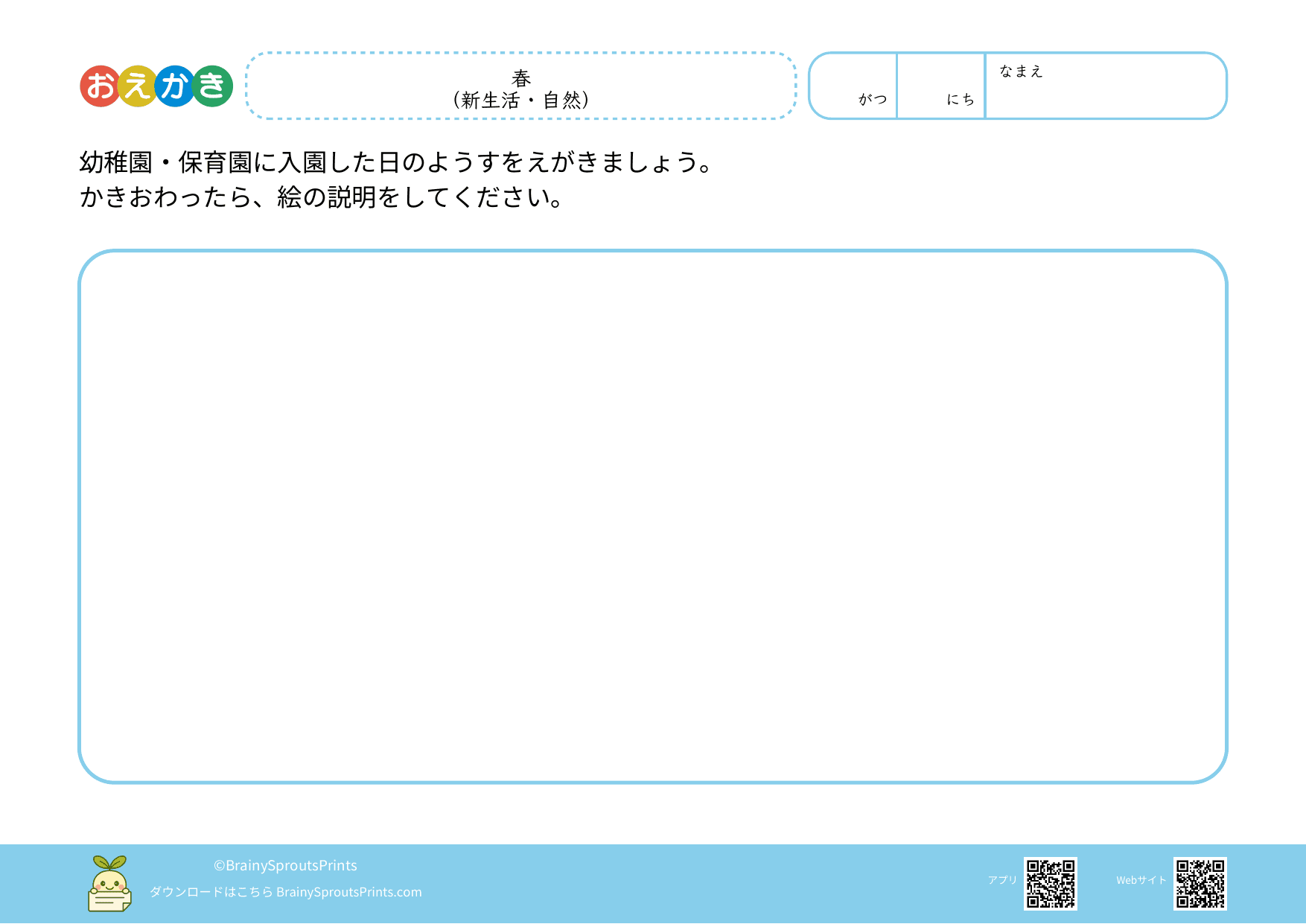 思い浮かべた場面や気持ちを、絵にして表すことを楽しめるプリントです。うまく描くことより、「何を描こうと思ったのか」「どこを面白いと感じたのか」が見えると、おえかきの時間がぐっと豊かになります。 自由に描ける余白がある分、描き始めるきっかけや、描いたあとにことばにする時間を少し足すと、表現の広がりが出やすくなります。