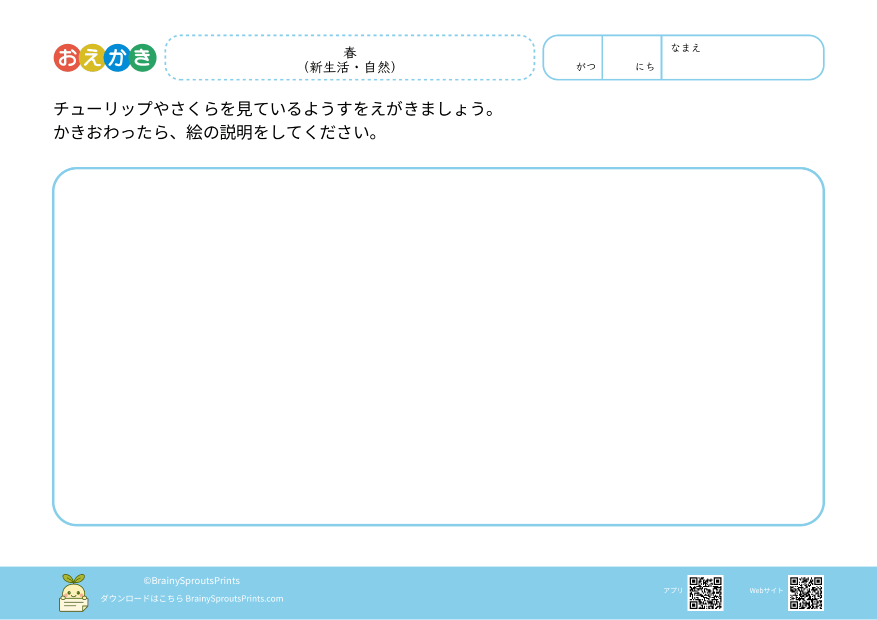 思い浮かべた場面や気持ちを、絵にして表すことを楽しめるプリントです。うまく描くことより、「何を描こうと思ったのか」「どこを面白いと感じたのか」が見えると、おえかきの時間がぐっと豊かになります。 自由に描ける余白がある分、描き始めるきっかけや、描いたあとにことばにする時間を少し足すと、表現の広がりが出やすくなります。