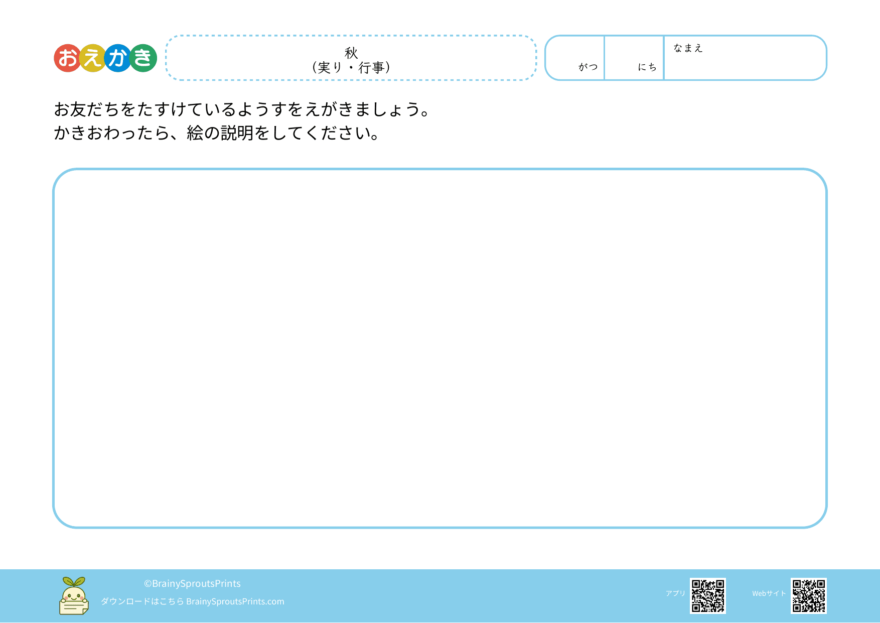 思い浮かべた場面や気持ちを、絵にして表すことを楽しめるプリントです。うまく描くことより、「何を描こうと思ったのか」「どこを面白いと感じたのか」が見えると、おえかきの時間がぐっと豊かになります。 自由に描ける余白がある分、描き始めるきっかけや、描いたあとにことばにする時間を少し足すと、表現の広がりが出やすくなります。