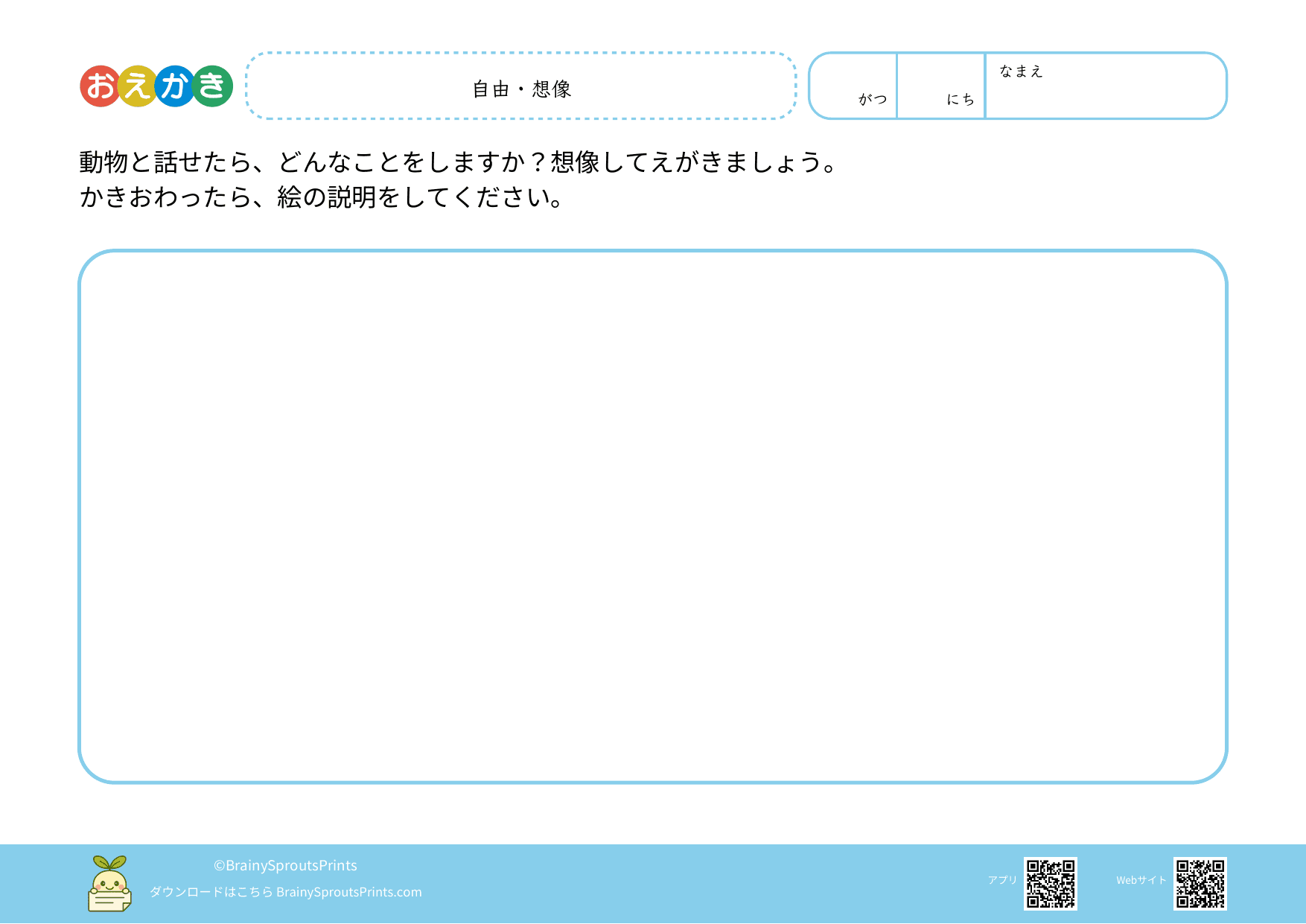 思い浮かべた場面や気持ちを、絵にして表すことを楽しめるプリントです。うまく描くことより、「何を描こうと思ったのか」「どこを面白いと感じたのか」が見えると、おえかきの時間がぐっと豊かになります。 自由に描ける余白がある分、描き始めるきっかけや、描いたあとにことばにする時間を少し足すと、表現の広がりが出やすくなります。