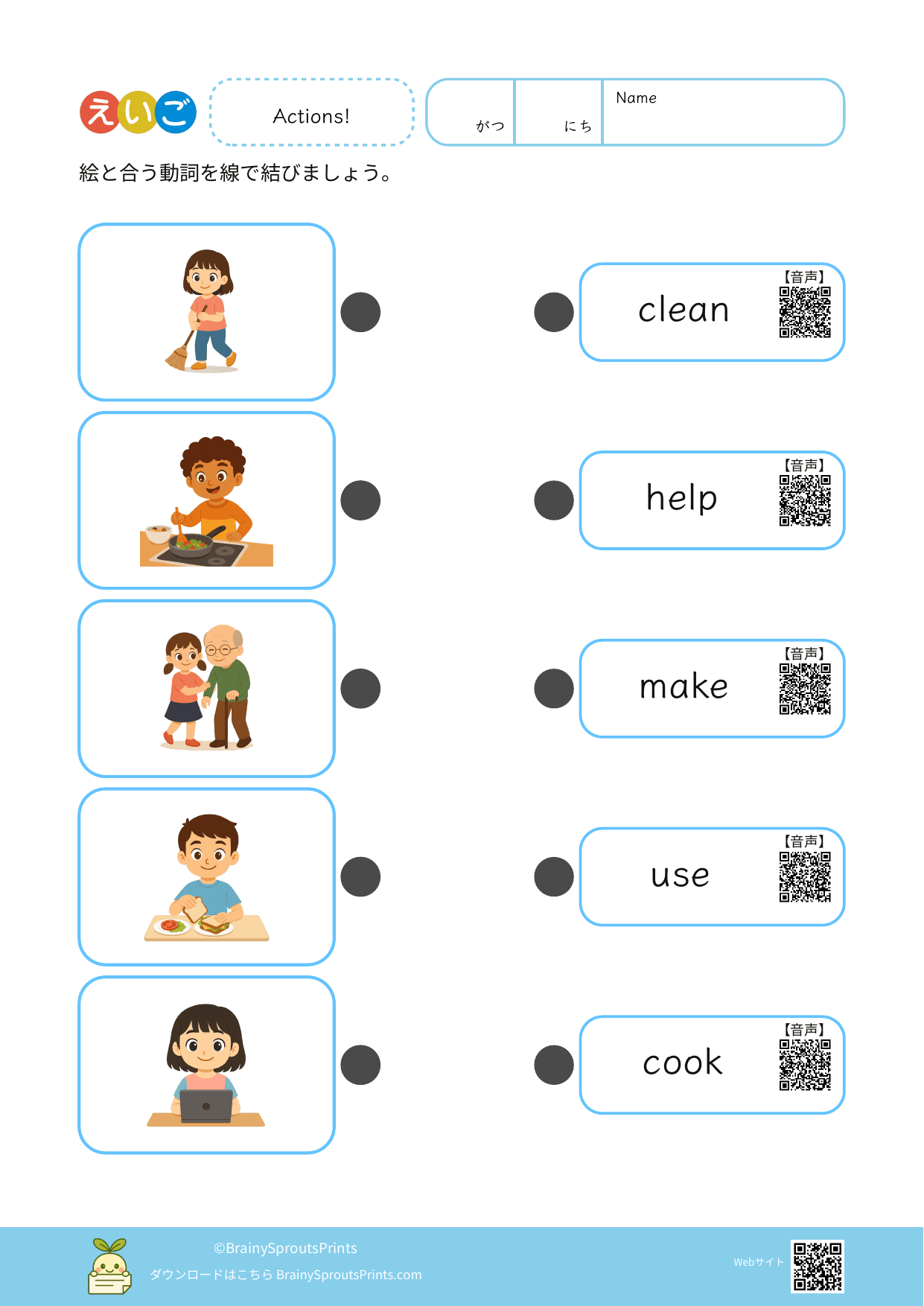 短い英語表現を、文の形として少しずつ確かめやすいプリントです。単語だけで覚えるより、誰が・何をするかというまとまりで見ていくと、使える形で残りやすくなります。