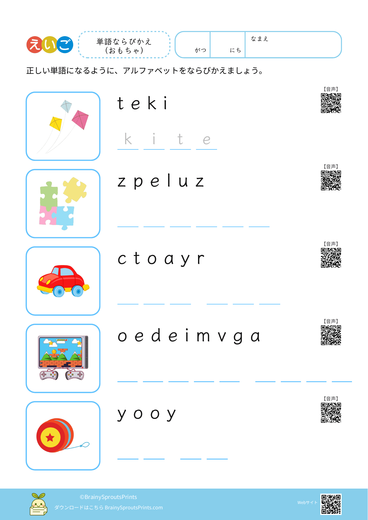 取り組んだあとは、「言いやすかった文字はどれ?」「似ていて迷った文字はあった?」と聞くと、つまずきが見えやすくなります。 身の回りの英単語や看板の文字と結びつけると、アルファベットが生活の中でも見つけやすくなります。