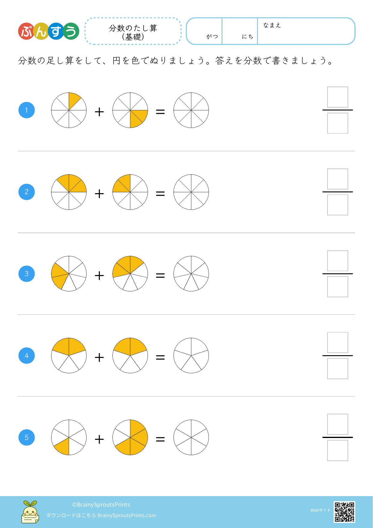 分けた大きさや数の関係を見ながら、分数の意味を整理しやすいプリントです。計算だけでなく、何を1と見るのか、どこを比べているのかを意識すると理解が深まりやすくなります。 図と式を行き来しながら使うと、分数が記号だけの学習になりにくくなります。