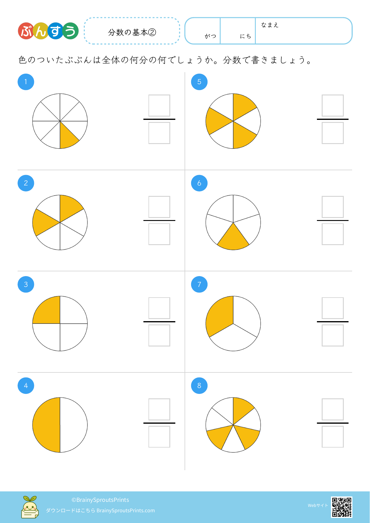 分けた大きさや数の関係を見ながら、分数の意味を整理しやすいプリントです。計算だけでなく、何を1と見るのか、どこを比べているのかを意識すると理解が深まりやすくなります。 図と式を行き来しながら使うと、分数が記号だけの学習になりにくくなります。